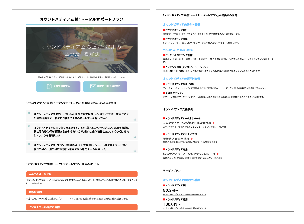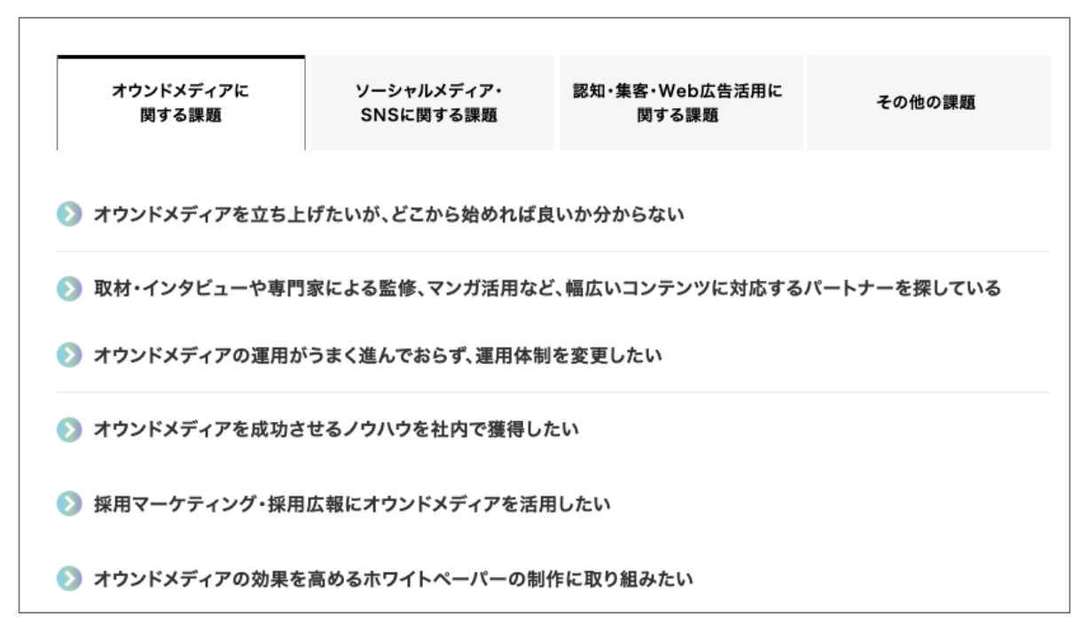 デザイン側で自然流入対策提案として、web施策での課題を複数提示する場所を設けることを提案しました。以前からサイトからの問い合わせで相談内容が指定された対応部署にうまく届かない事例が多いことがわかっており、ユーザー側からすると部署名や業務内容ではサムライトの業務内容がわかっていない(マーケティングリテラシーが高いお客さんばかりではない)ため、課題ベースでの入り口を設けました。