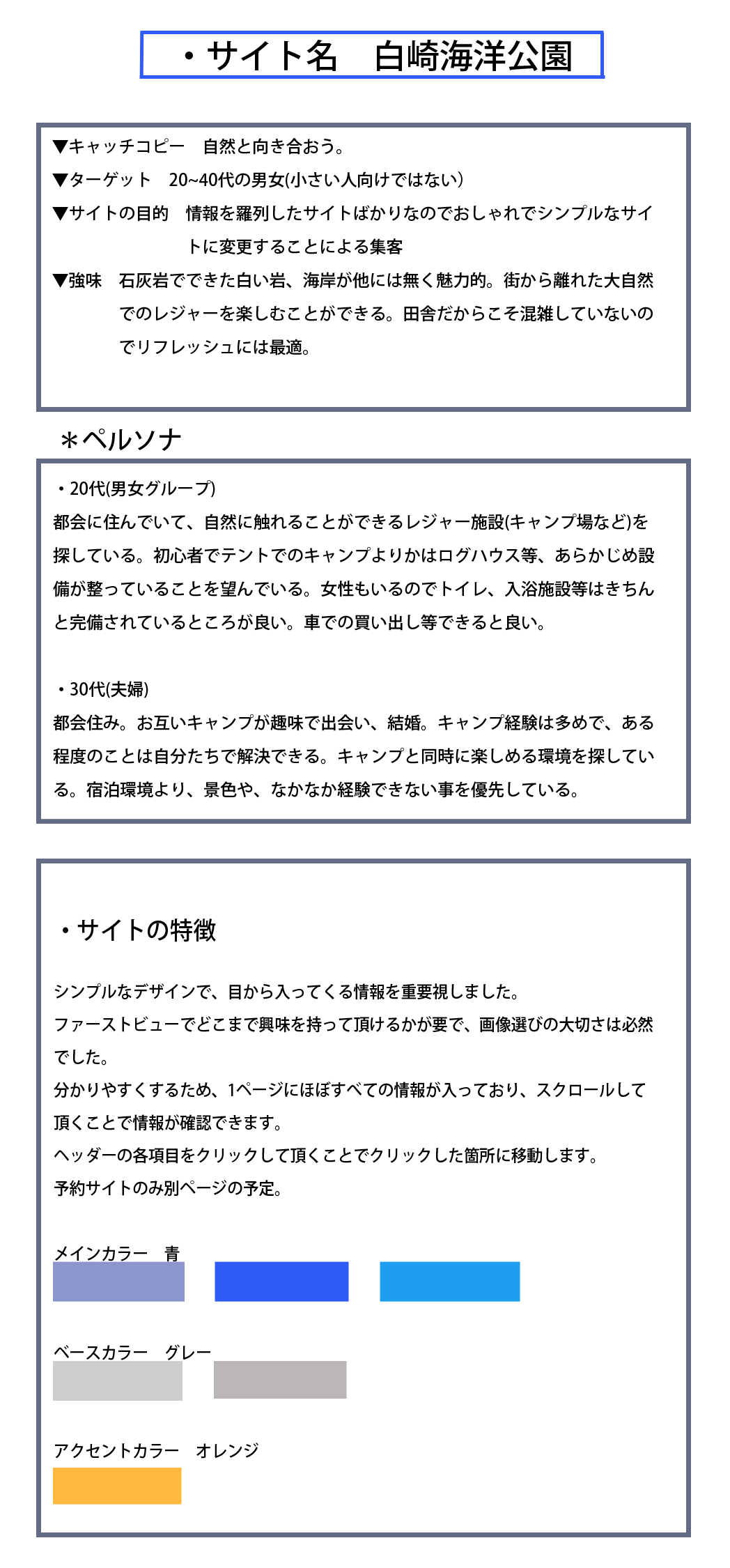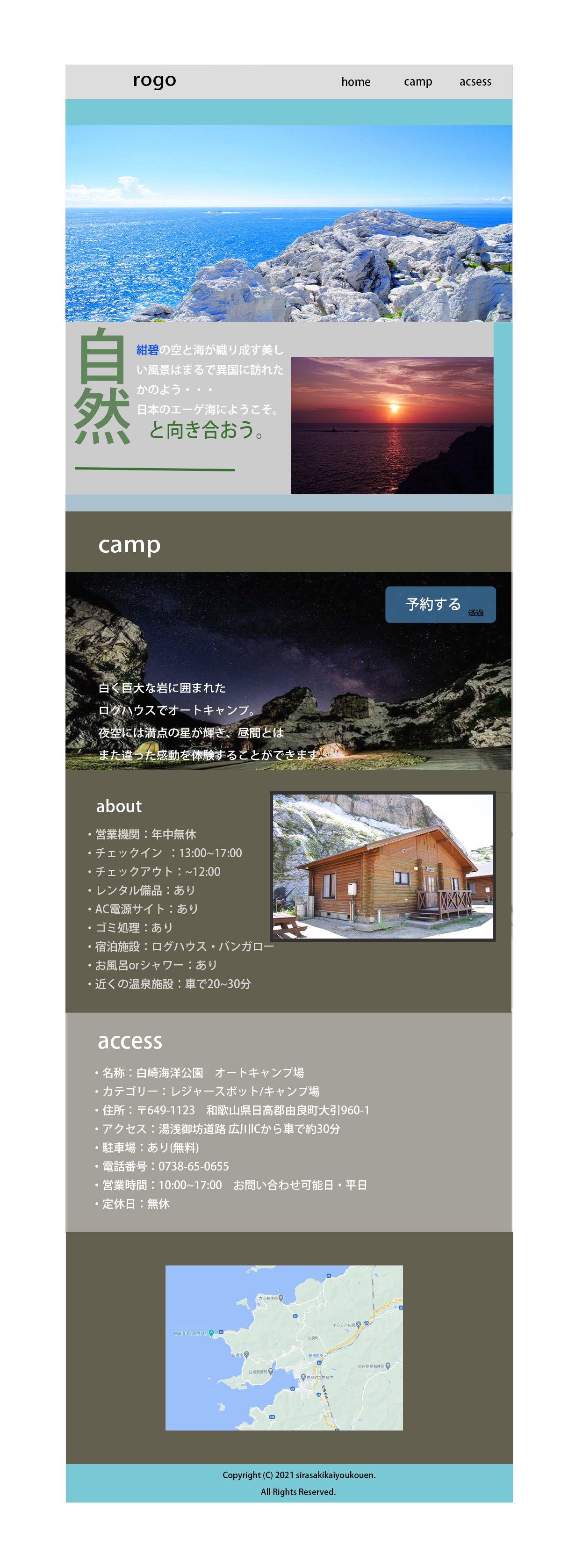 白崎海洋公園 トップページ(仮) ryo OVERVIEW 自然と向き合おう。 地元の隠れ観光スポットの架空サイトです。 YEAR 2021 白崎海洋公園自然と向き合おう。架空サイトのトップページとコンセプトを作成しました。使用ソフトPhotoshopデザインコンセプト