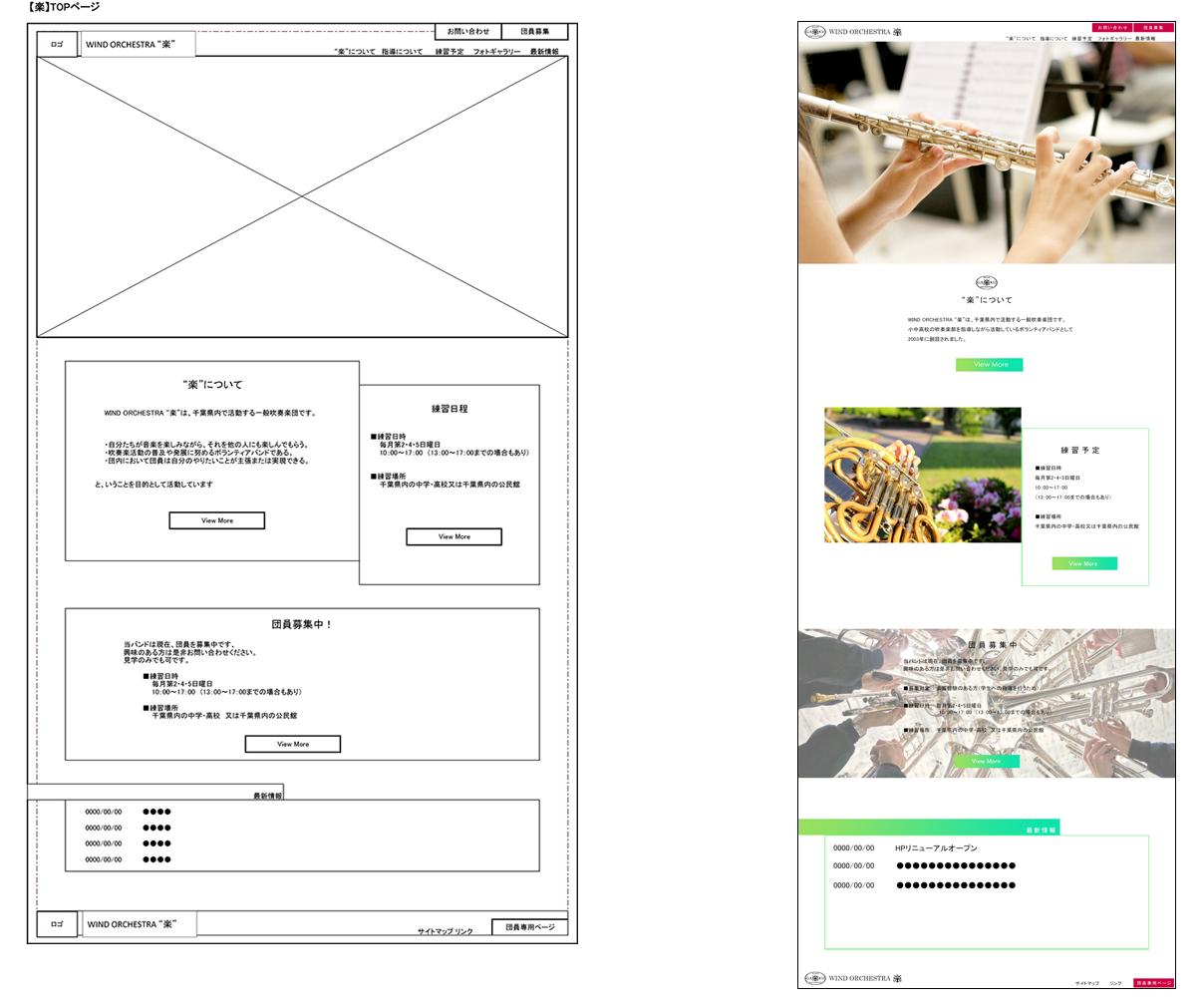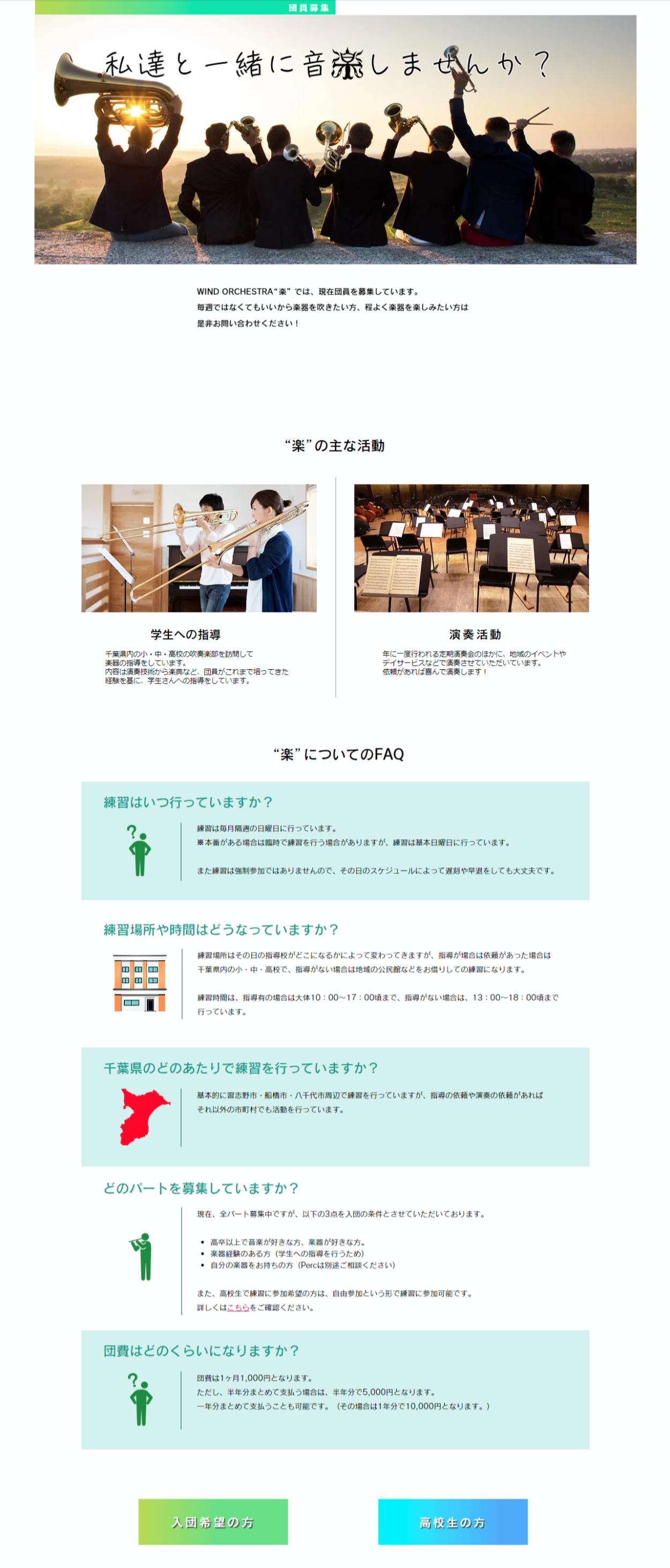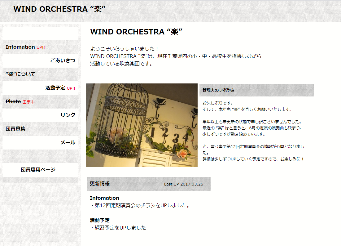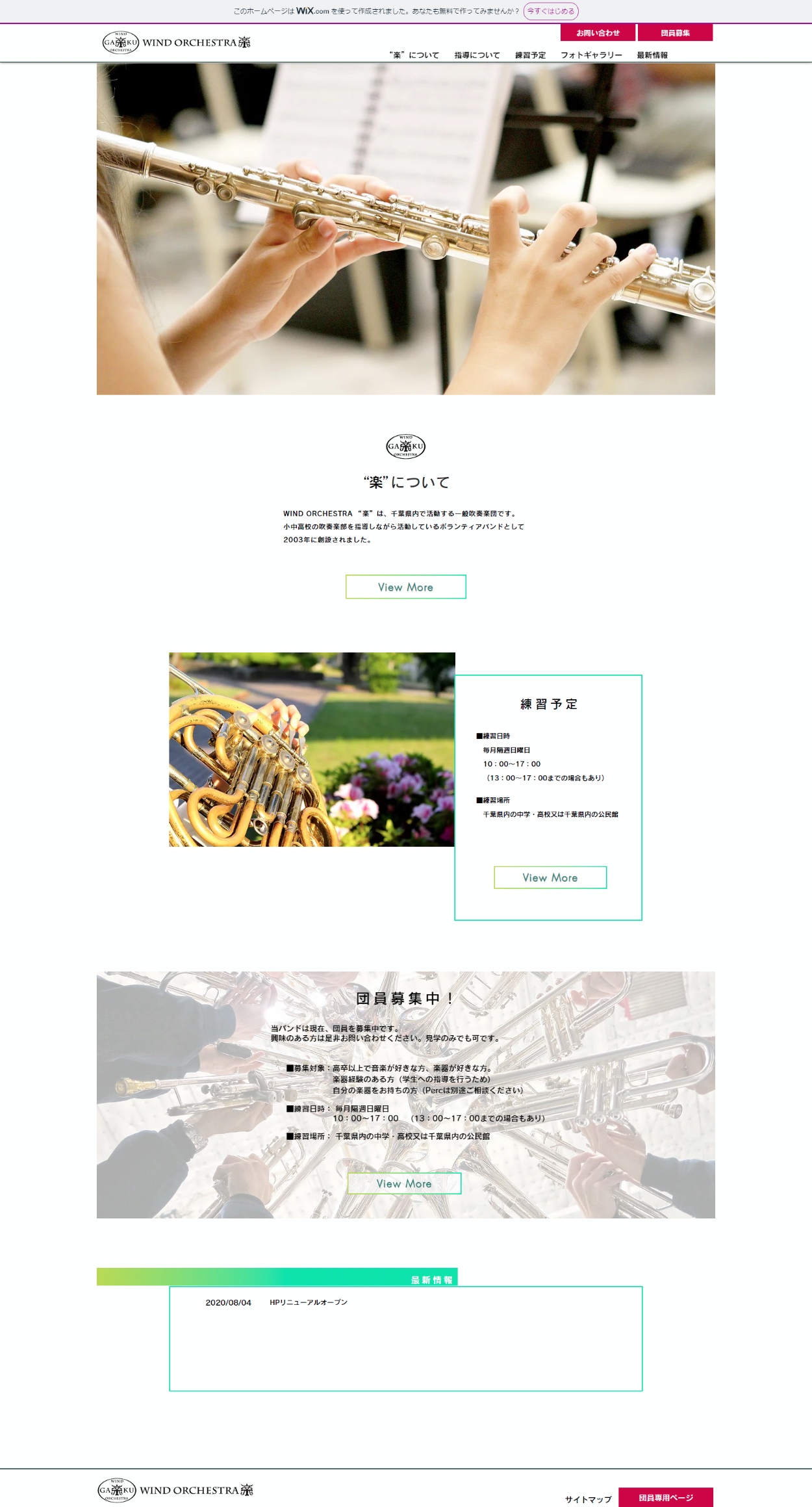 所属している一般吹奏楽団『WIND ORCHESTRA “楽”』のWebサイトリニューアル。 元々使用していたレンタルサーバーの閉鎖に伴い、新たにサーバーをレンタルし、 1から全て作り直した。