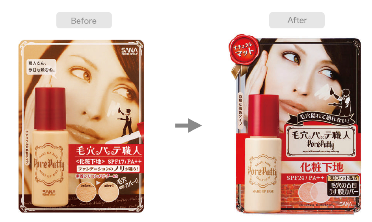 常盤薬品工業(株) サナ事業部(メイク) 全6製品のリニューアル 及び 6製品の新商品パッケージデザイン 全12 アイテム |毛穴パテ職人|毛穴に特化したベースメイクシリーズ。10 代~40代まで幅広く毛穴に悩む女性から支持されている。価格は1,000~1,500 円。