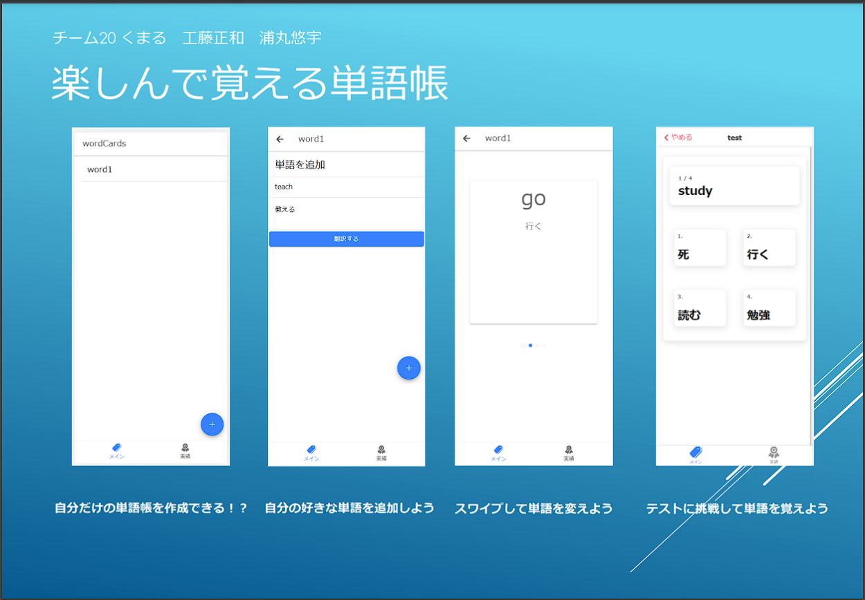 WordCards kumastry 大学院生 OVERVIEW チーム制作:楽しんで覚える単語帳アプリ YEAR 2021 英単語を楽しんで覚えようこのアプリでできること単語帳の作成や英単語の追加英単語を追加するときの翻訳機能単語帳をスライドして鑑賞作成した単語帳に対して、四択や記述式でクイズクイズを解き続けることで実績を解除ローカルストレージに保存しているので、サインイン必要なしPWA対応ポスター作品紹介Webページ WEBSITE