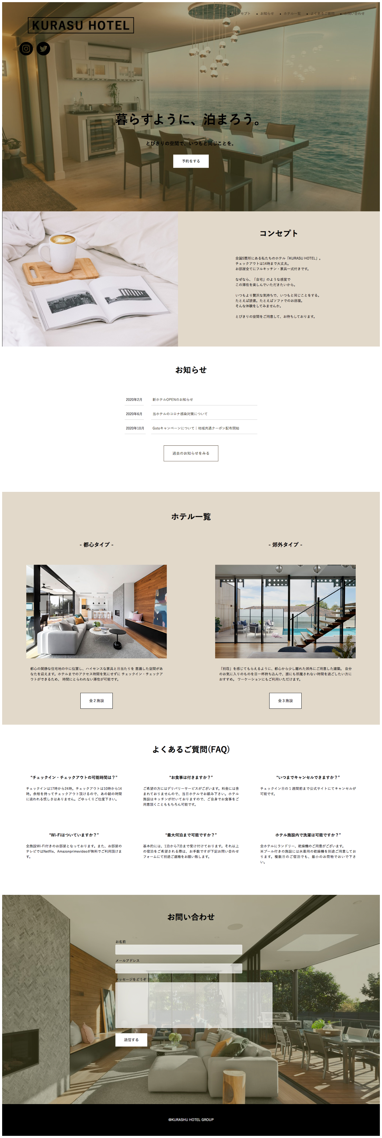 ・サイトを開いた際に写真(ホテルの雰囲気を最も視覚的に伝えやすい)が引き立つよう、フォント・背景・ボタンについては可能な限り使用種類を抑え、シンプルにした