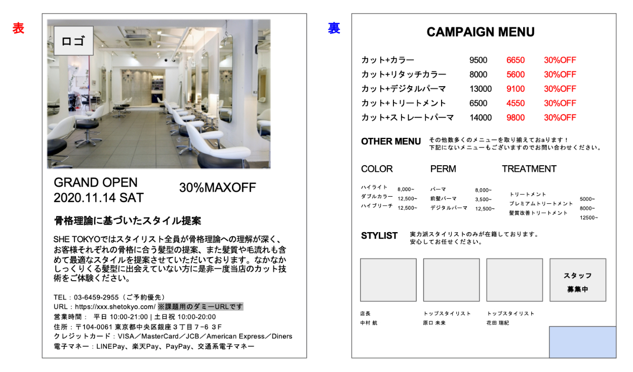 WEBサイトと印刷物の作成の違いを体感しました。WEBと違ってズームができないため、パッと見て読めるような文字サイズにする必要があることがわかり、単位のptを初めて使用してサイズの間隔をつかみました。 - 印刷物ならではの制作方法