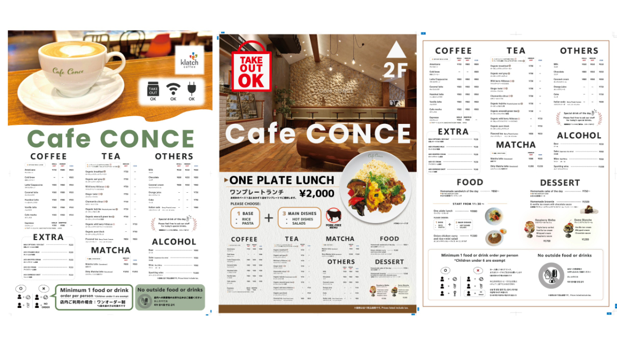 Cafe CONCE (左からA0,A1外用立て看板&A2ショーケース横設置メニュー表)