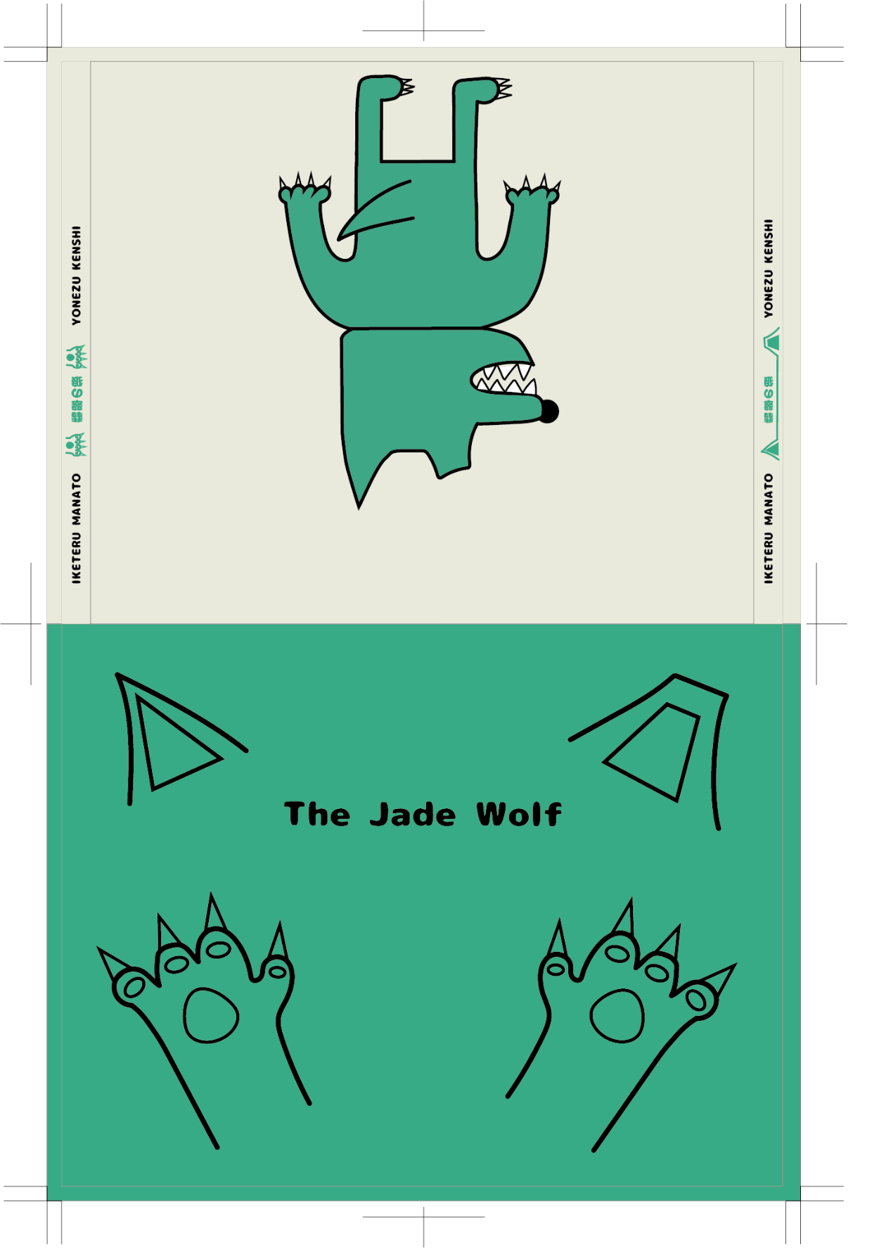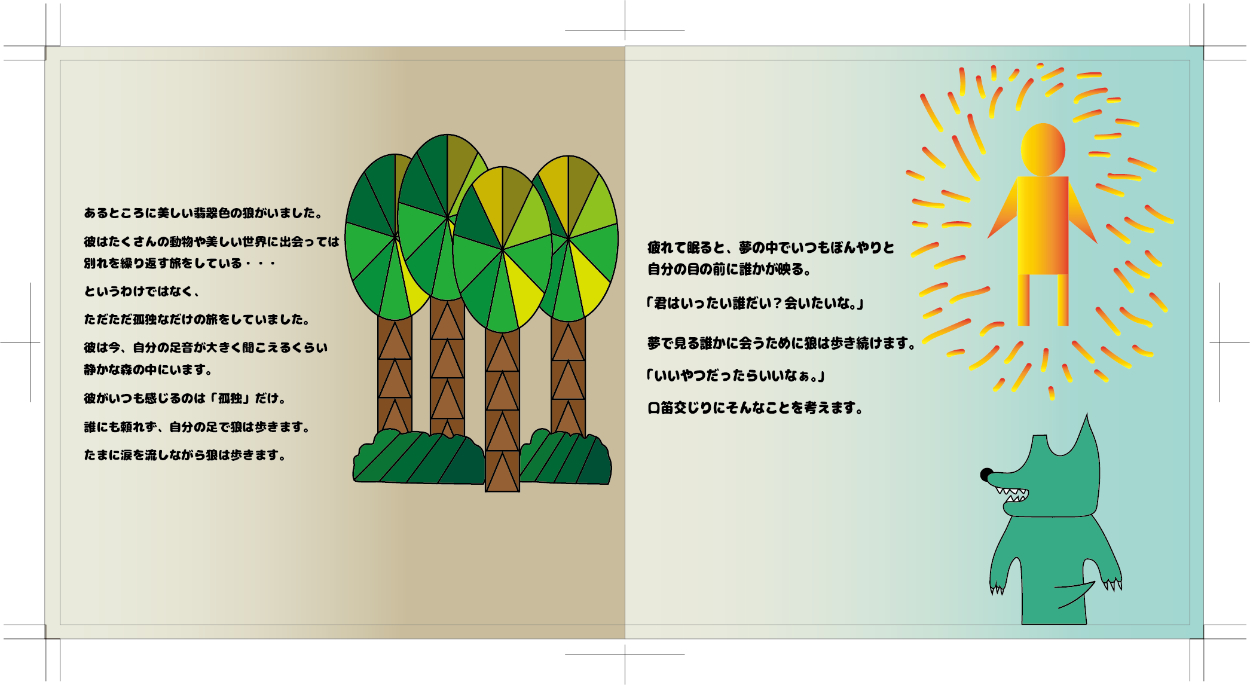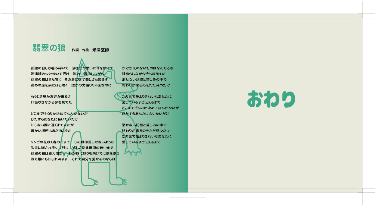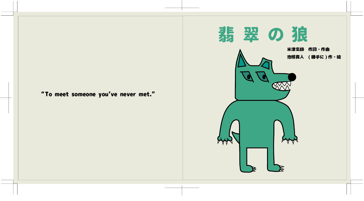 米津玄師さんの「翡翠の狼」という曲のCDジャケットと歌詞カード、円盤のデザインを勝手に学校の課題としてさせていただきました。私がこの曲が好きというのもありますがこの曲を絵本で表現してみたいという願望があったのでこの曲を選びました。絵本のストーリーは自分で考え、狼などのデザインも米津さんのデザインっぽい感じにして背景を含めillustratorを使って制作しました。実際のCDケースに入れるものなのでケースの大きさなどに注意しながらのサイズ調整が難しかったです。デザインは意外と好評でこれから授業を受ける学生に向けてお手本として出すらしいです。