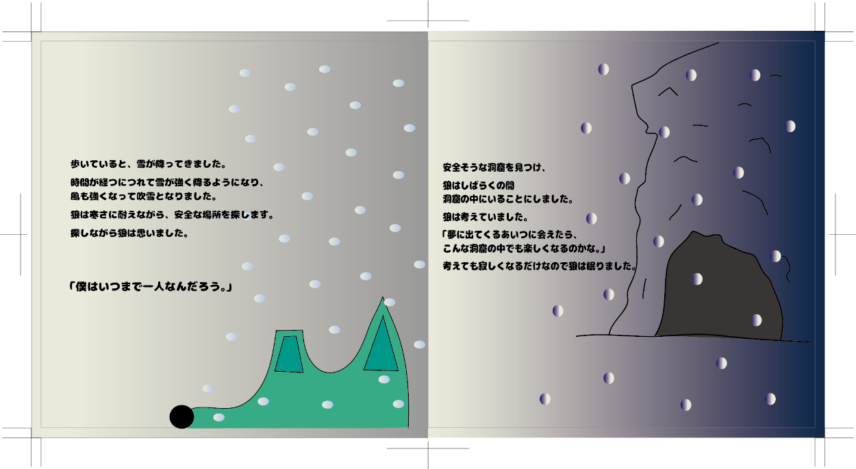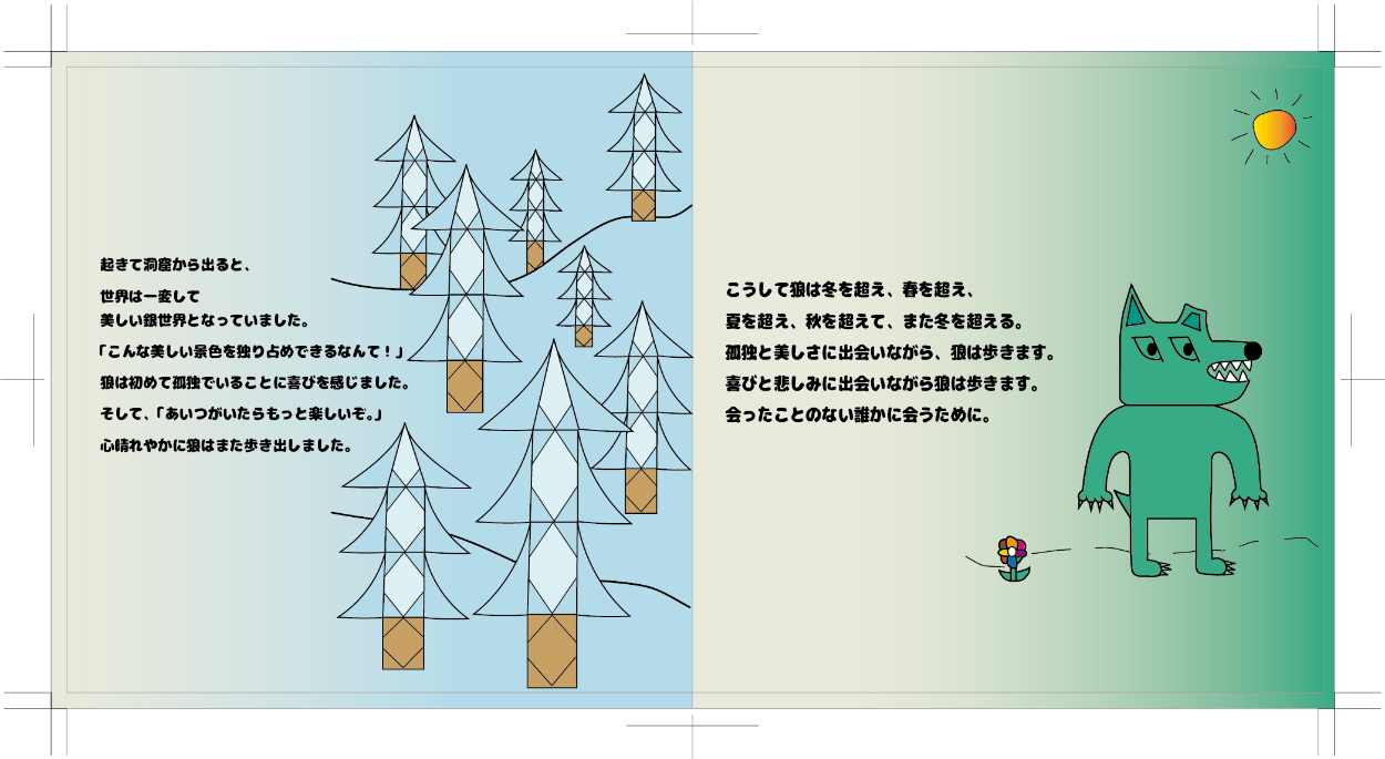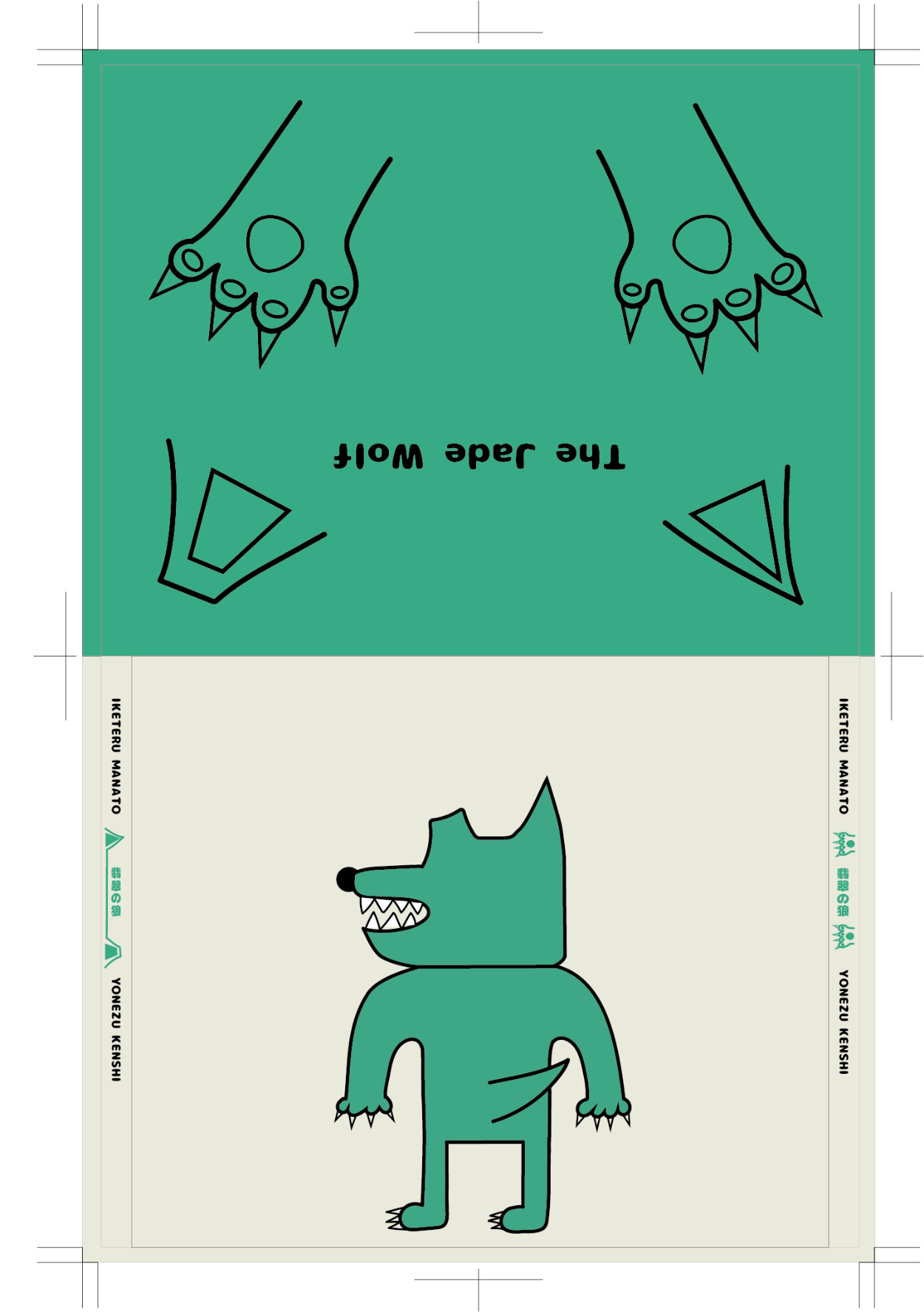 米津玄師さんの「翡翠の狼」という曲のCDジャケットと歌詞カード、円盤のデザインを勝手に学校の課題としてさせていただきました。私がこの曲が好きというのもありますがこの曲を絵本で表現してみたいという願望があったのでこの曲を選びました。絵本のストーリーは自分で考え、狼などのデザインも米津さんのデザインっぽい感じにして背景を含めillustratorを使って制作しました。実際のCDケースに入れるものなのでケースの大きさなどに注意しながらのサイズ調整が難しかったです。デザインは意外と好評でこれから授業を受ける学生に向けてお手本として出すらしいです。