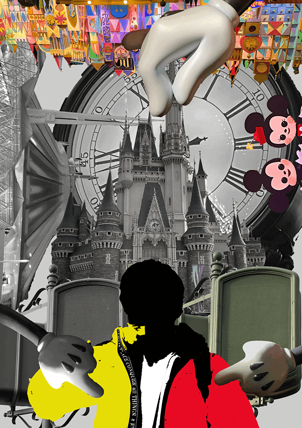 ここで初めてPhotoshopを使ってのコラージュ作品を制作しました。最近取った写真を使っての制作でちょうどディズニーランドに行く予定があったのでたくさん撮ってきました。私自身がディズニー作品に小さい頃から触れてきたので私とディズニーの関係性を表現しました。