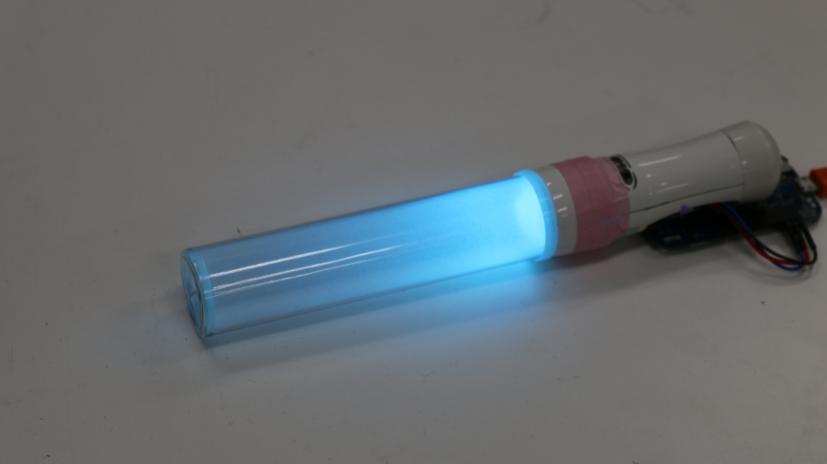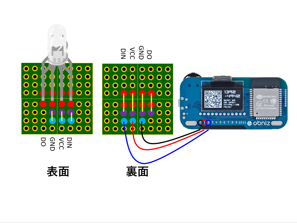 ペンライトの改造を行った。ペンライトを分解した後、中に入っていた LED と基板を入れ替えた。実体配線図を下に示す。黄色の線はメッキ線である。ユニバーサル基板にマイコン内蔵RGB 5mm LED(PL9823-F5)を 2 つ並べて取り付け、obniz の 0 番ピンにGND(黒線)、1 番ピンに VCC(赤線)、2 番ピンに DIN(青線)を繋げる。ユニバーサル基板が 2cm×2cm と小さかったため、LED とメッキ線の取り付けに苦労した。ペンライトの電池が入っていた部分に導線が収まるように配線を工夫した。