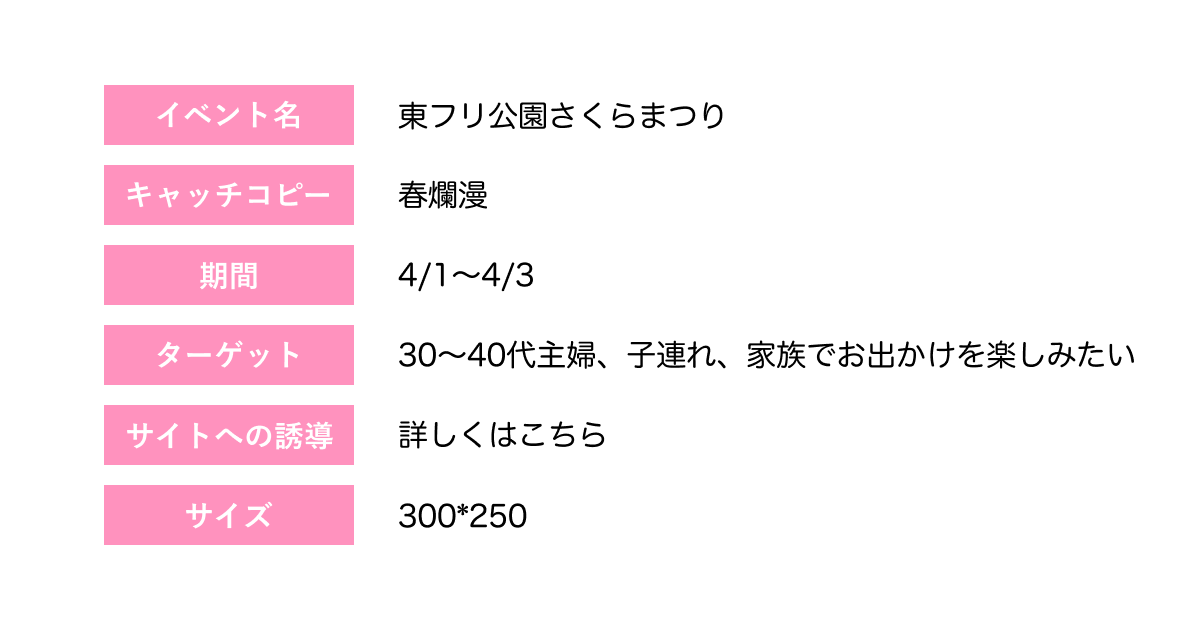 提供写真が「さくら(ピンク)+青空(水色)」であまり多くの色を使うとカラフルでごちゃごちゃしたイメージを与えてしまうと考えたので、ピンクのなかで濃淡を変化させてシンプルな配色にし、40代主婦に刺さるよう落ち着いた雰囲気を目指しました。
