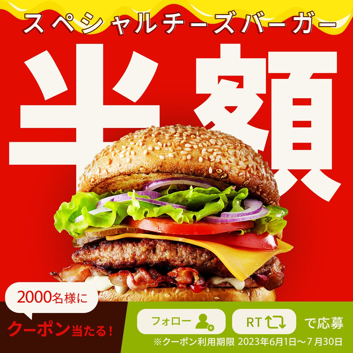 大きなチーズバーガーと半額であること、両方のインパクトを出すために文字と写真を大胆に配置しました。