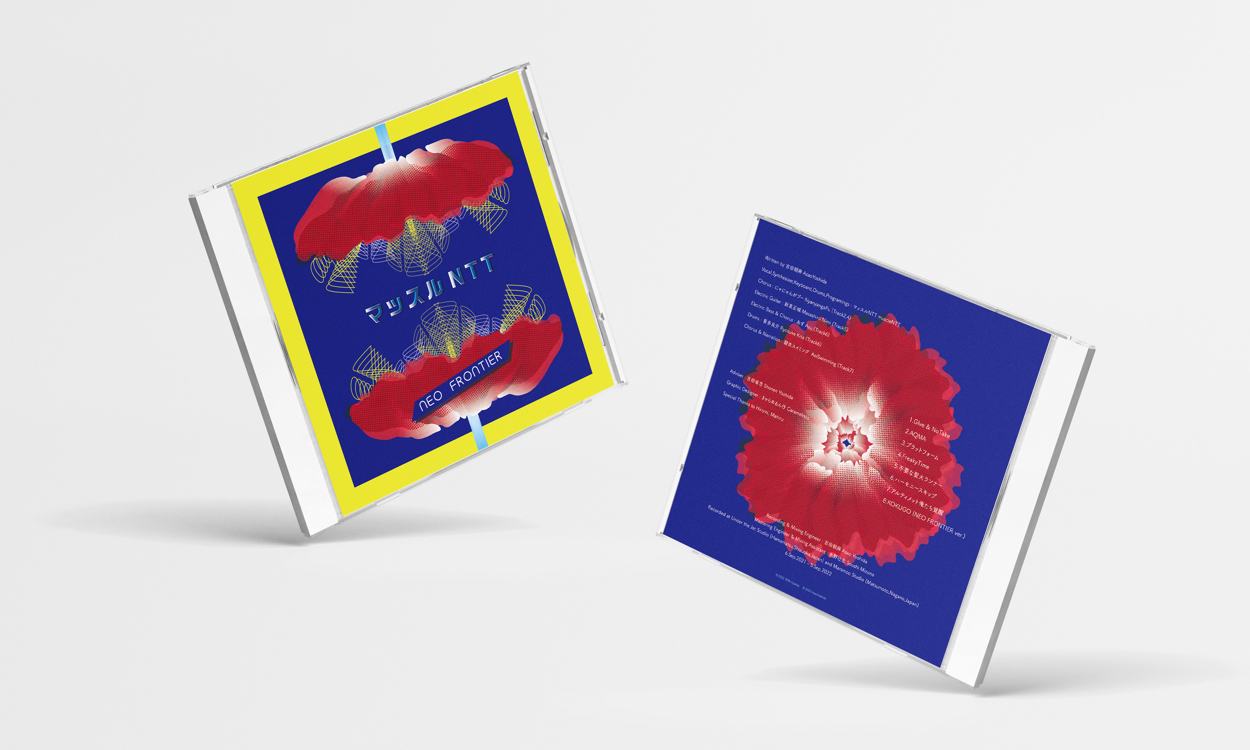 - NEO FRONTIERは白字の後ろに背景と同じ青色の崩れすぎないマスキングテープをイメージしたパスを配置することで、花びらの上でも白字を目立たせるようにし、花びらのリソグラフ風と合わせて紙モノを連想させるようにした。