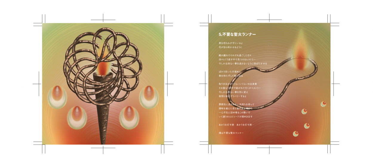 - 歌詞ページのグラフィックでは、花びらの1枚を表現し、加えて、あかりを灯す旅の旅路に起こるエピソード・ヒストリーの1つをピックアップする感じでイメージした。