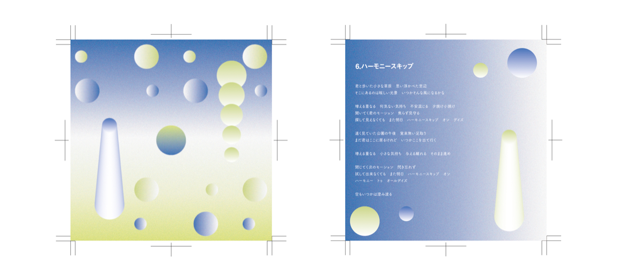 - 君と歩いた小さな草原から、メイングラフィックの背景のグラデーションを空の青・草原の黄緑・中心に白を入れて2色を分けることでそこにあるのは眩しい光景の眩しさにあたる部分を表現した。