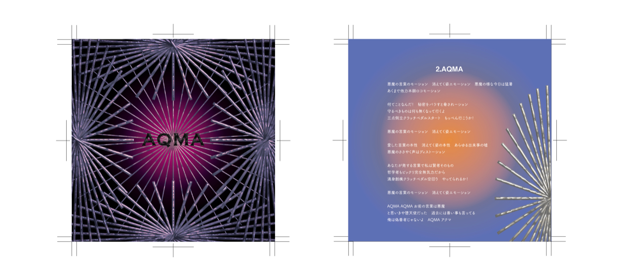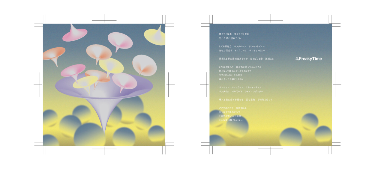 アーティスト活動兼、専門学校非常勤講師をしている方から、CDジャケット・8曲分のメインビジュアル、歌詞ページ・盤面の制作のご依頼をいただき、デザイン担当として携わらせていただきました。