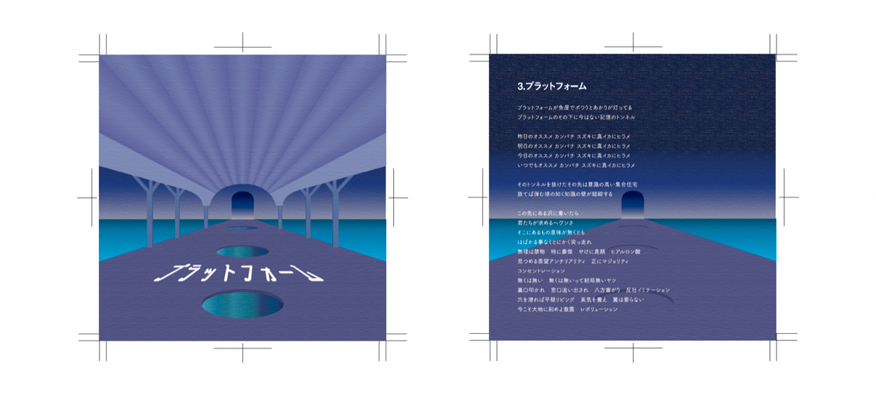 - プラットフォームのその下に今はない記憶のトンネルから、メイングラフィックでは穴が空いているようにし、歌詞ページではその穴が埋まって、くぼみだけが残っているようにした。