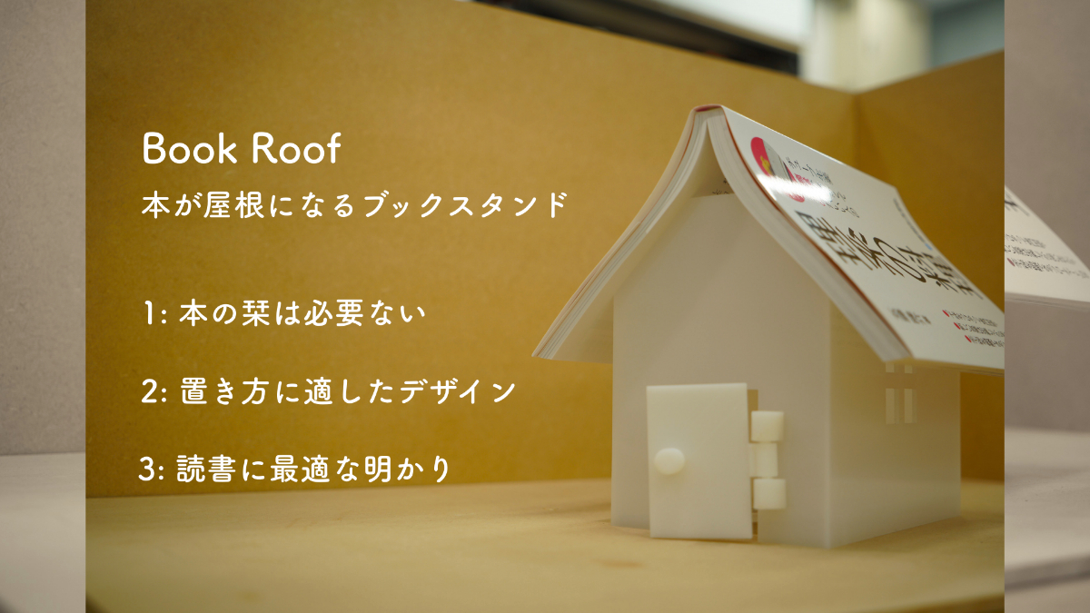 Book Roofは本を伏せて置く専用のブックスタンドである.途中まで読んでいたページは伏せて置くことで保持され,Book Roofの上に置くことで「屋根」となり,見た目を損なわない. また,Book Roofは読書灯の役割もある.読書を中断するとライトは消え,読書を再開すると周囲の暗さに応じてライトが点灯する.「本を伏せて置く」という無意識の行為に着目している.