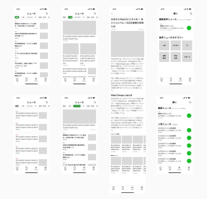 ページの構成としては、記事ページ(TOP)、音声記事ページ、マイページ、設定ページをメインページとして考えました。