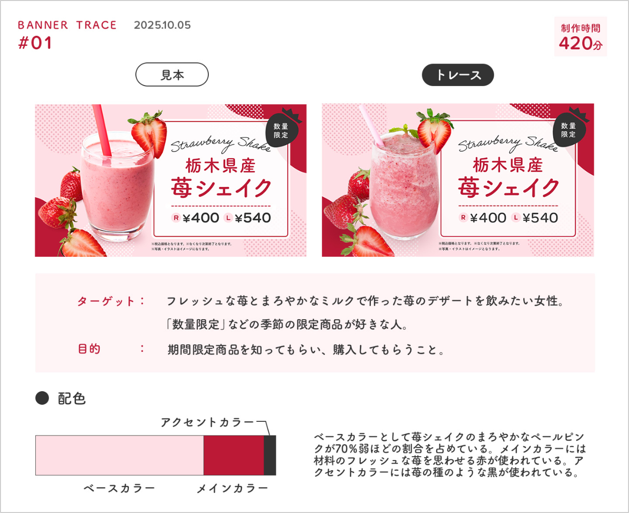 SHE likes PRO DESIGNER COURSの1つ目の課題として、バナートレースに取り組みました。また「ターゲット・目的」「配色」「情報設計」「ビジュアルデザイン」などについての分析結果もまとめました。