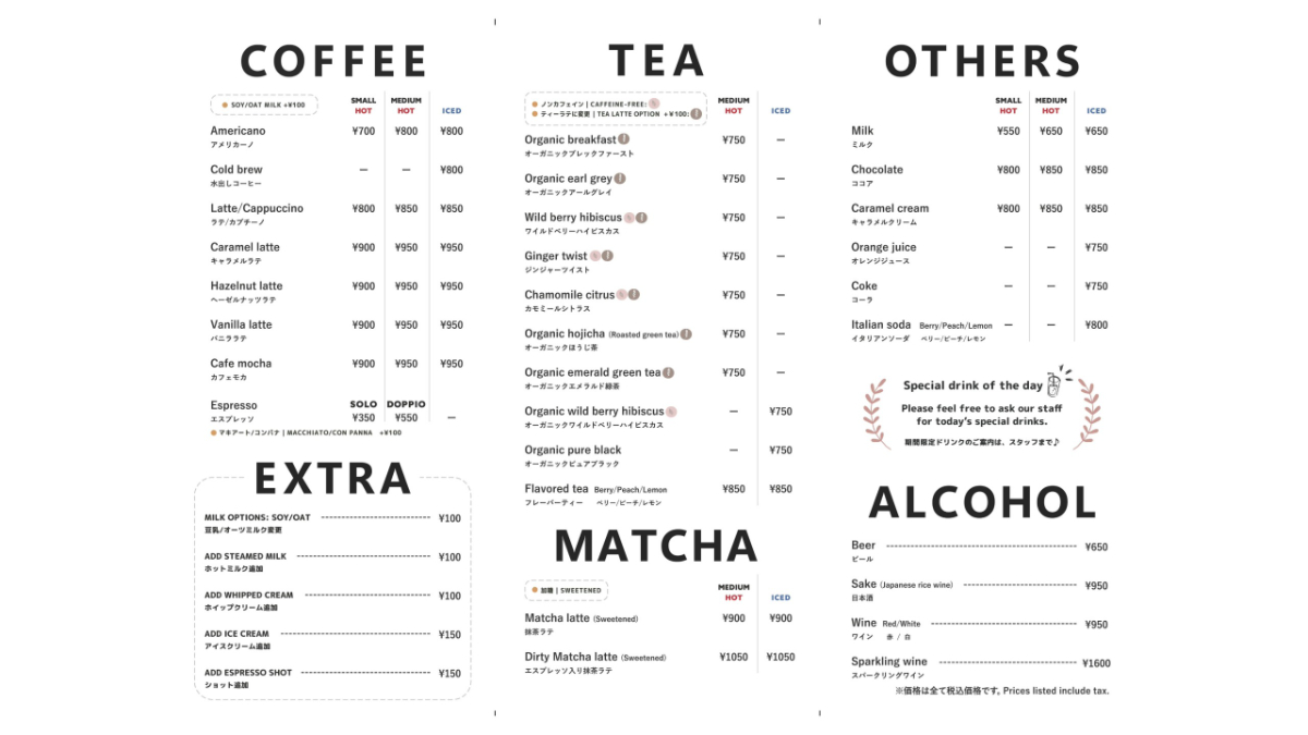 大分類(COFFEE / TEA / FOOD など)を大きく配置し、探しやすいレイアウトに整理