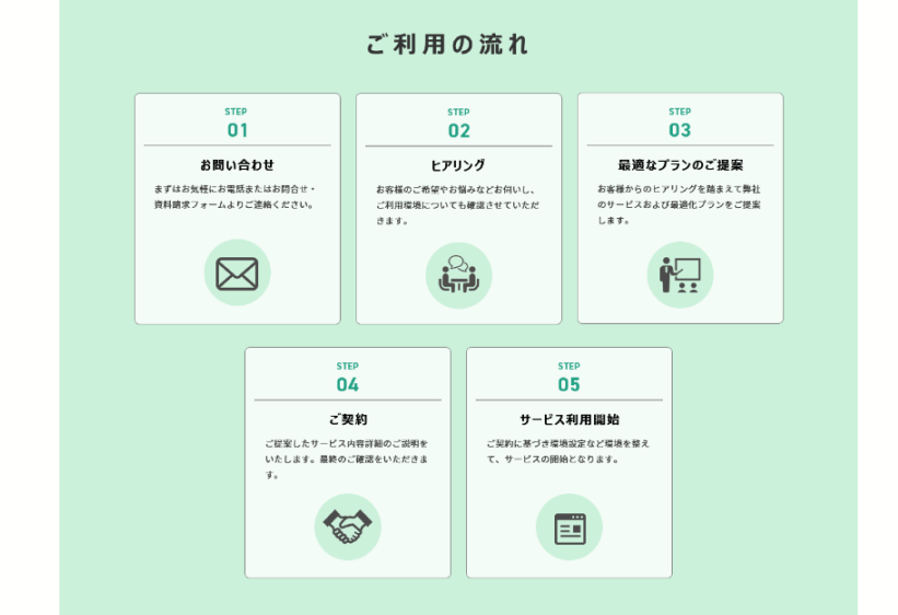 具体的なサービス内容が直感的に理解できるよう、アイコンと説明文をバランスよく配置しました。