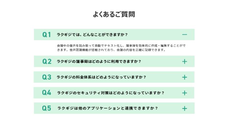 FAQセクションではサポートの内容を確認しながら、サービスの概要と特徴を把握できるように工夫しました。