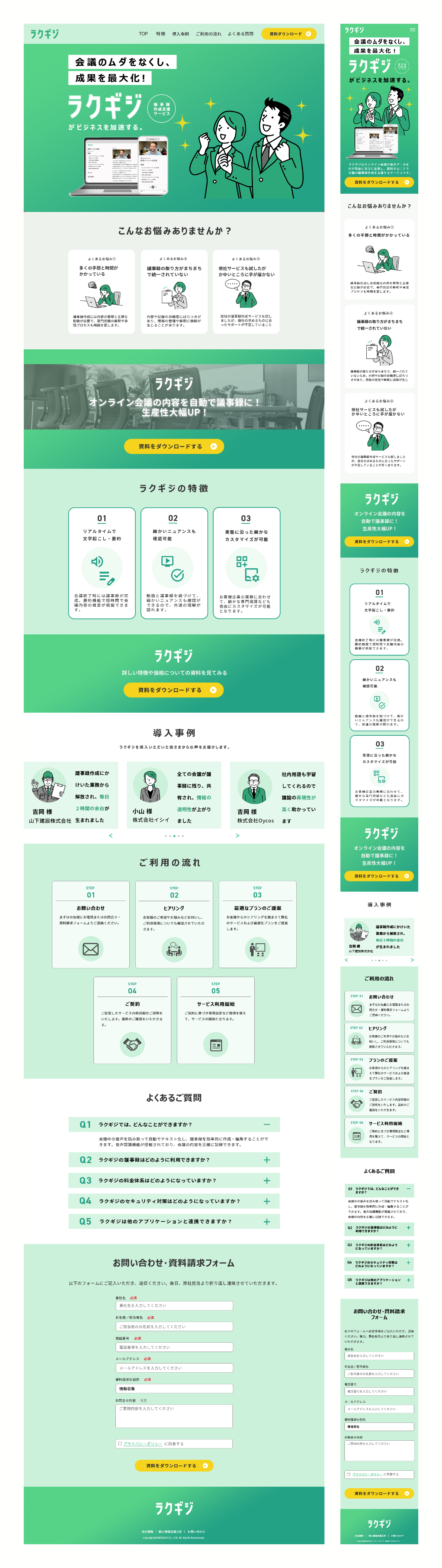 ラクギジを導入した結果、業務効率を実感して喜んでいる様子のイラストを配置しました。イラストの配色も背景色にあうように同系色の緑に統一しました。また、利用シーンをイメージしやすくするためにPCや携帯のスクリーンにサービスのイメージできるようにモックアップを作成しました。