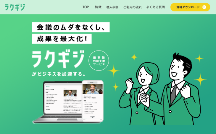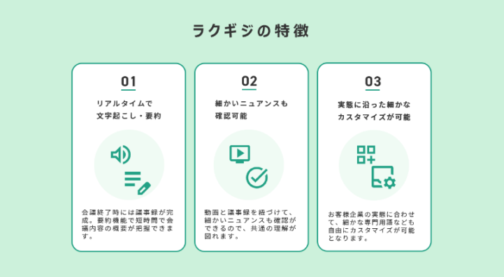 オンライン会議の音声をもとにしてAIが会話内容を文字起こし・要約し、議事録を自動で作成してくれるサービス「ラクギジ」。簡単な設定で議事録作成の手間から解放し、皆さんの仕事の生産性を大幅に向上させます。