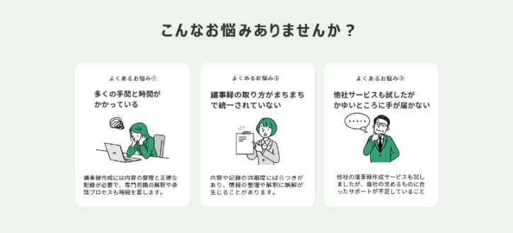 - 日常の業務量や会議が多く、議事録作成に時間を割けないため、会議の効率化や時間の節約を求めている方