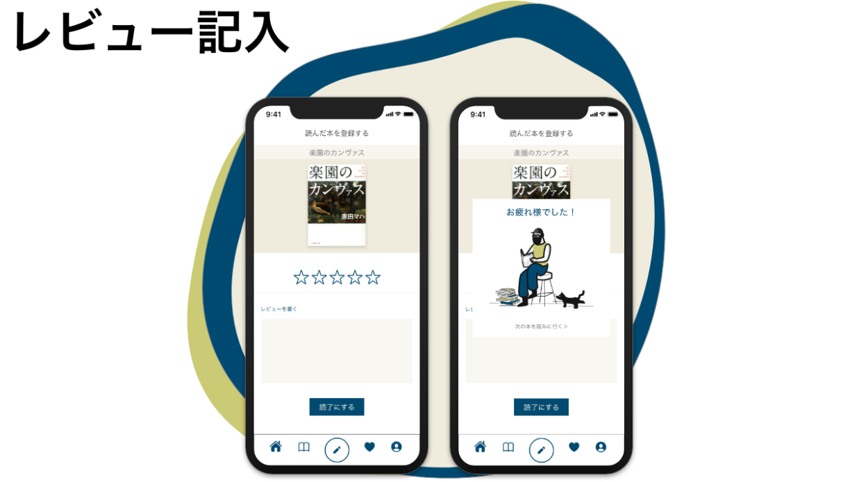 本を読み終えたら下部中央の鉛筆マークで読了にすることと、レビューの記入をできるようにしました。 それらの記入が完了したら、ユーザーを労うちょっとした一言が表示されます。読み終えた後のタスクを減らして、シンプルなUIにすることで手軽さを感じてもらえるようにしました。