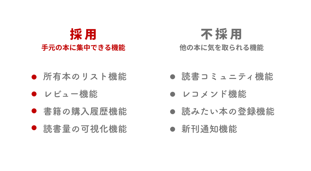 現在ターゲットユーザーに普及している読書アプリから主要な機能を洗い出して、その中から「手元の本に集中できる」機能を取り上げることにしました。レビュー機能は自分用の記録を残す意図で採用しました。