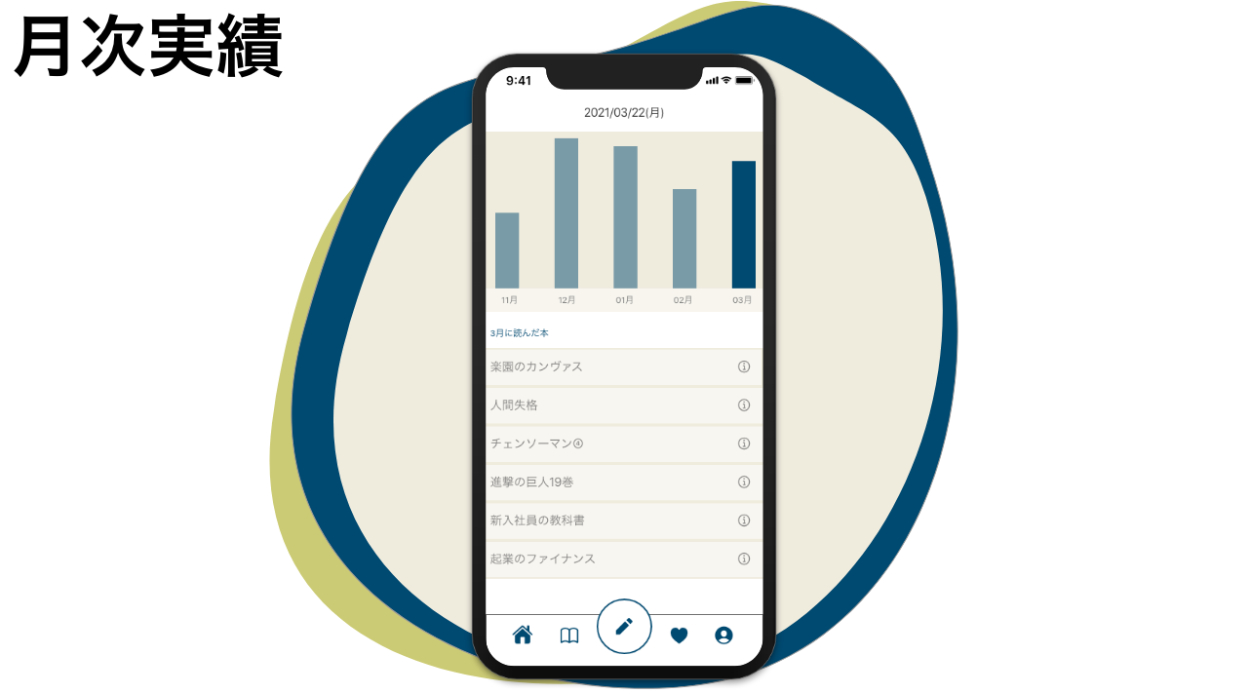 過去の読書データを月次実績として確認できる画面です。色の濃淡を付けることで選択月が直感的にわかるようにデザインしました。画面下部にはその月読んだ書籍をリスト表示しています。