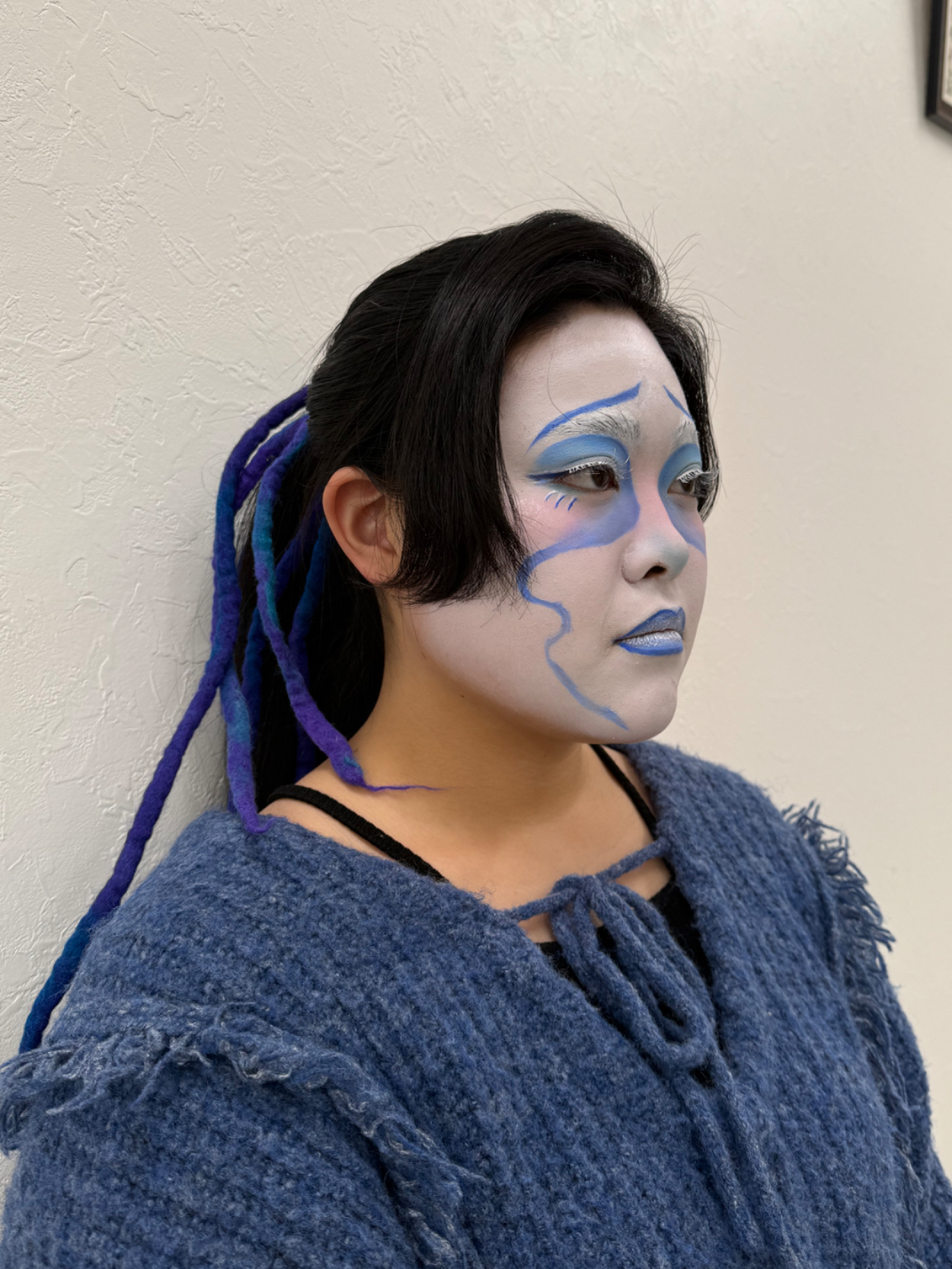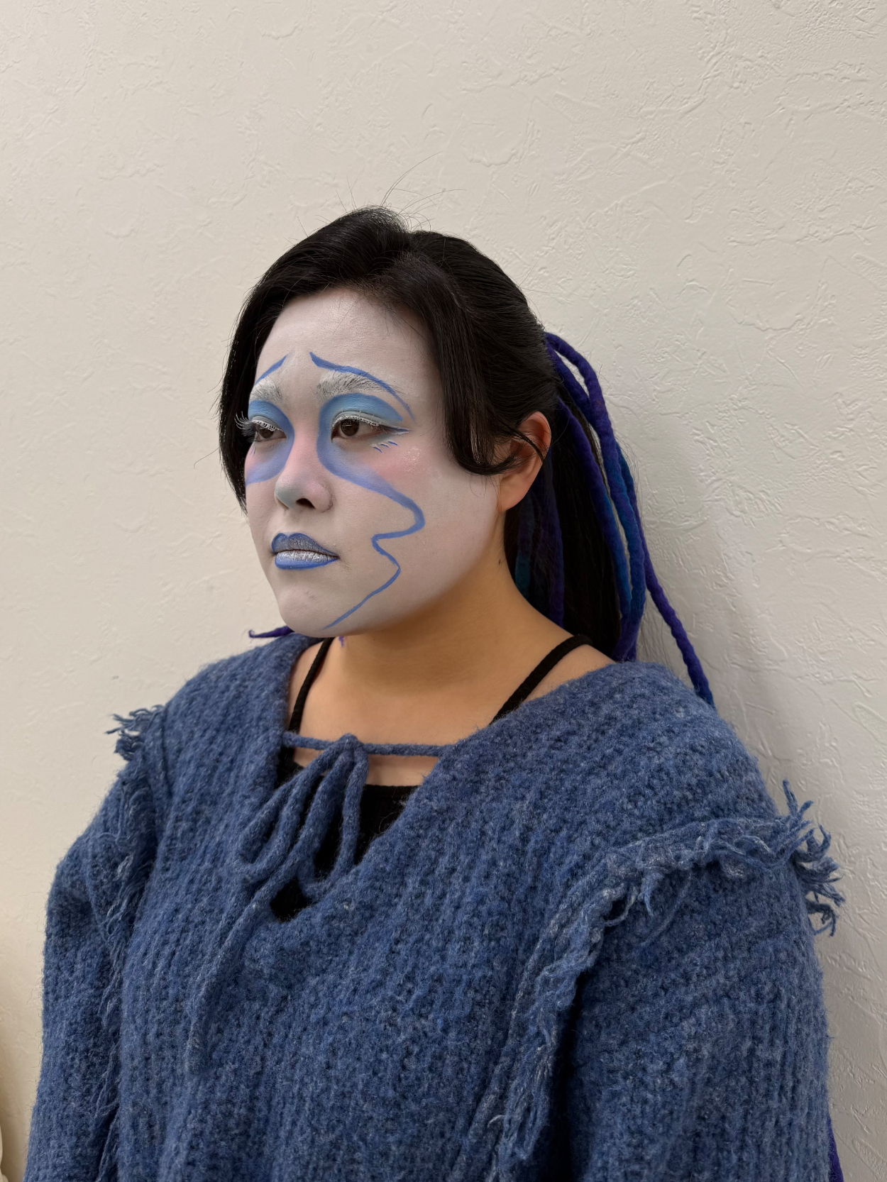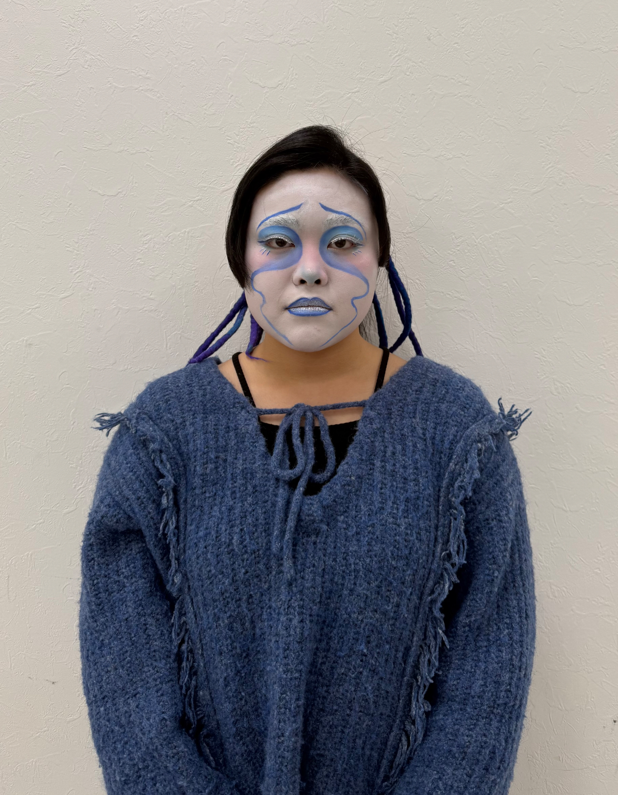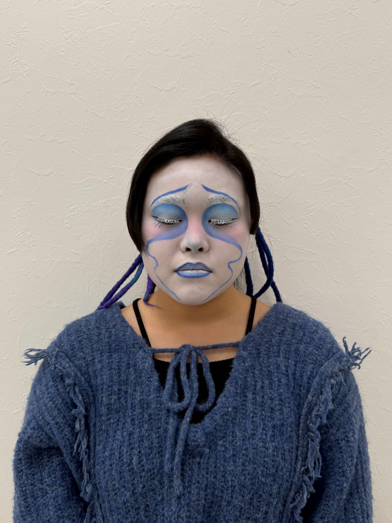 喜怒哀楽 飯島愛彩 専門学生 ブルーのグラデーションが自然につながるように、濃淡を細かく調整しました。アイシャドウとフェイスペイントの境目が浮かないようにぼかしを工夫したところを特に意識しました。悲しく見えるようにラインは下重心になるように工夫しました。