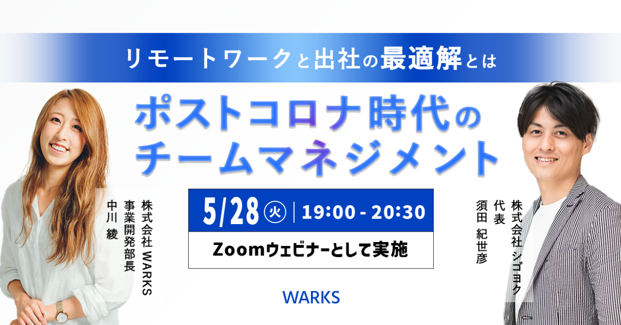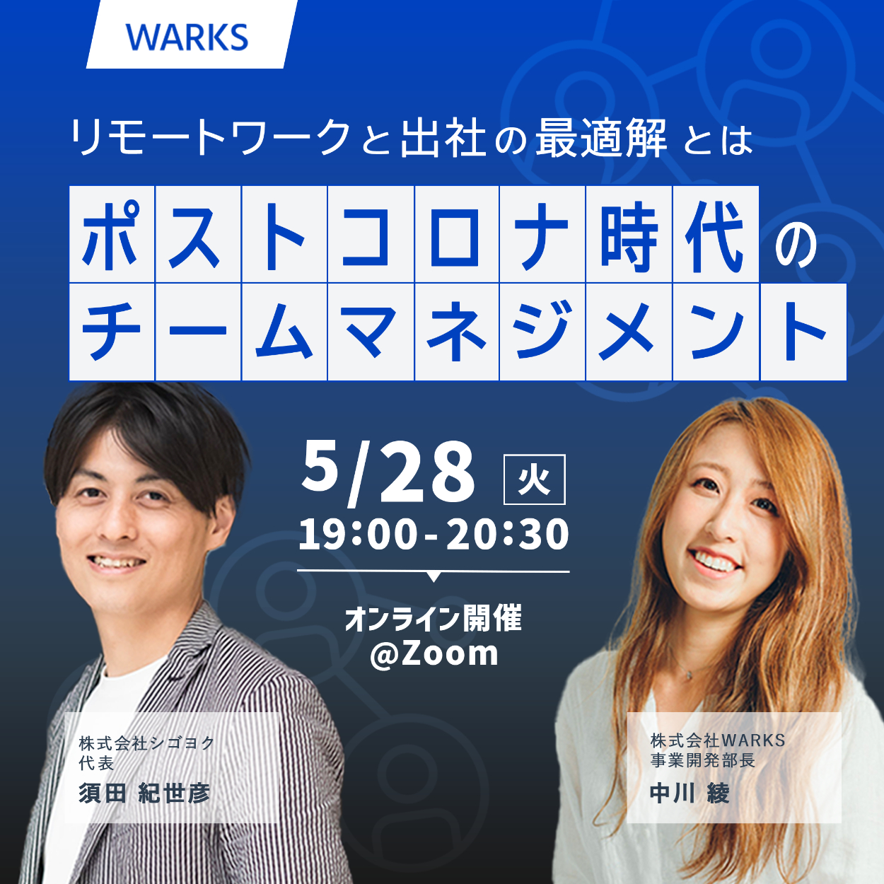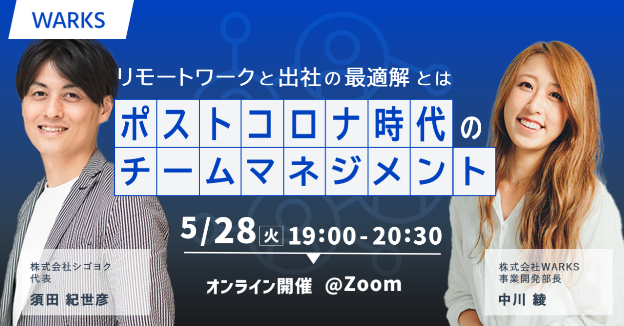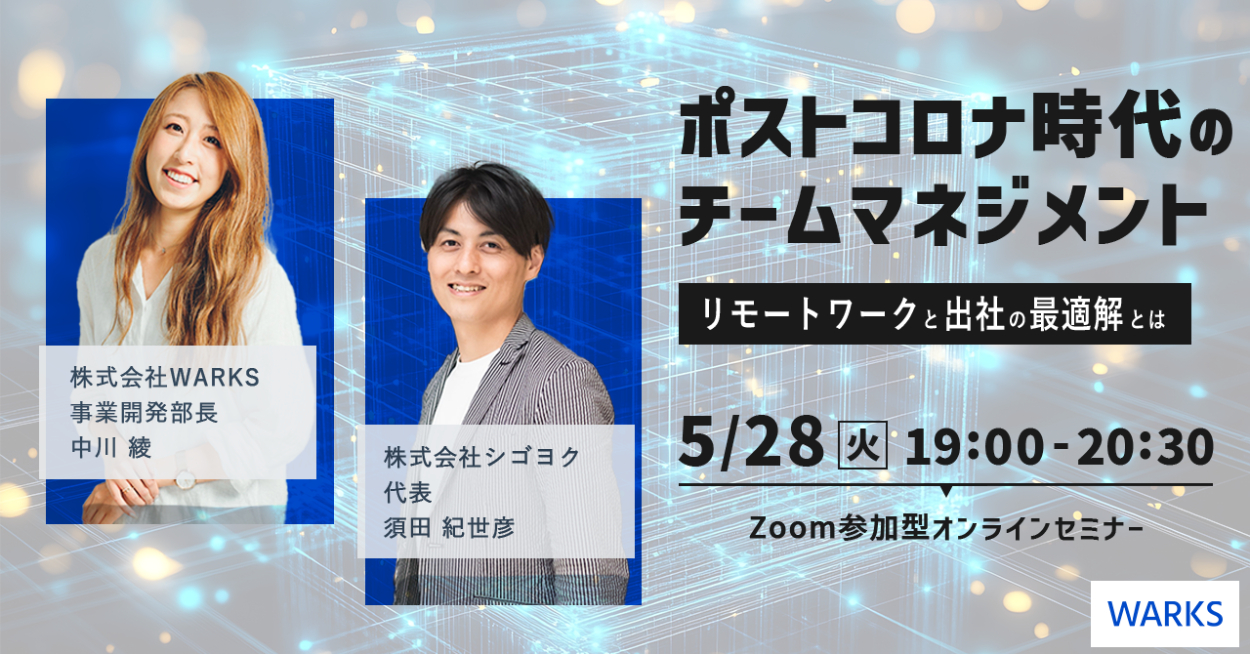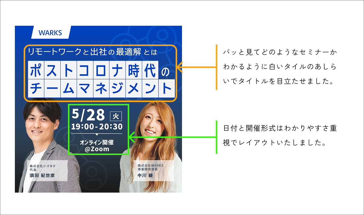 タイトルの「リモートと出社の最適解」から人と人のつながり・働き方をテーマに作成し、人同士のつながりを表現したイラストを背景に配置しました。セミナーの核となる「人とのつながり」というメッセージを視覚的に補強しつつ、親しみやすい印象を演出する意図で使用しています。