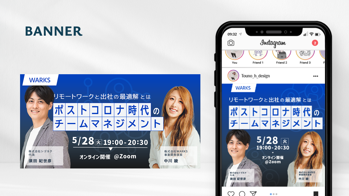 カラーグラデーションの調整が、デザイン全体の印象を大きく左右する重要な要素であることを実感しました。コーポレートカラーの青でビジネスの誠実感を表現し、そこに黒のグラデーションを加えることで、さらに落ち着きと安定感を演出する方法があると学びました。また、男女を左右対称に配置することで、視覚的なバランスを取り、イベント情報に自然と視線が向かうレイアウトを目指しました。