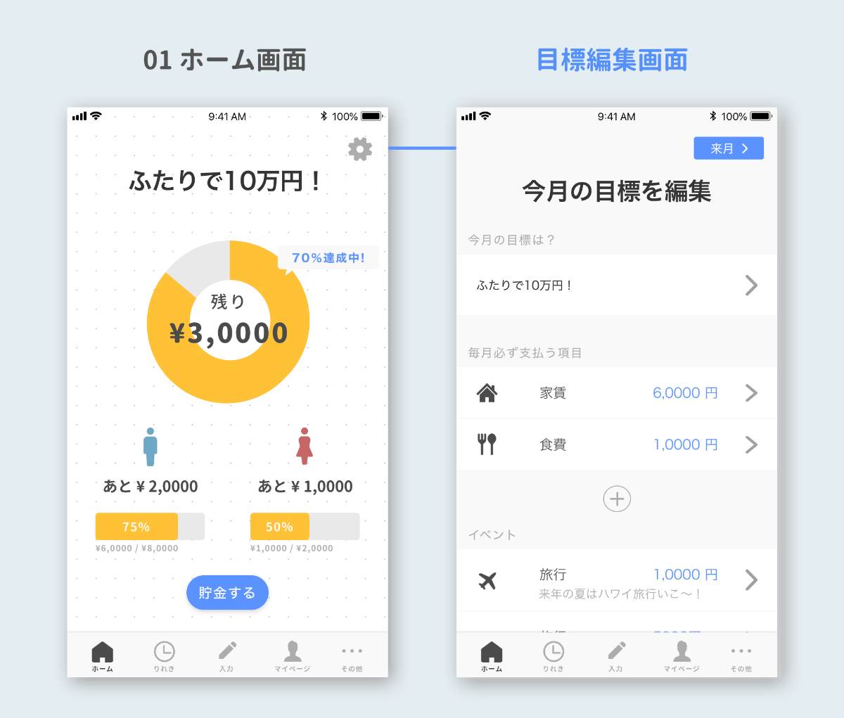 本来、お金の管理は夫婦が一緒に暮らす上で大切で、生活の中で当たり前に話し合って決めることが自然なはずなので、アプリでは2人が共通の目標をもって、コミュニケーションを取りながらお金に対してポジティブな気持ちで一緒に貯金ができるような機能とトンマナを選ぶことを大切にしました。