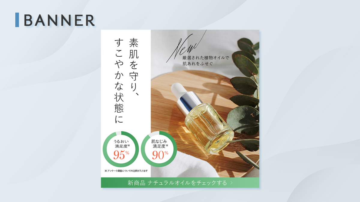 バナートレース CHIHARU 想いに寄り添うデザイン OVERVIEW コスメバナーのトレースをしました。制作時間:5時間 使用ツール:Photoshop YEAR 2025 1 制作物2 制作期間5時間3 トレースをして学んだこと写真の色調補正のやり方を学べた。テキストの変形のやり方や、ペンツールで書き足す表現を知れた。グラフの作り方を学べた。