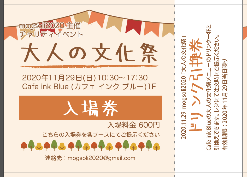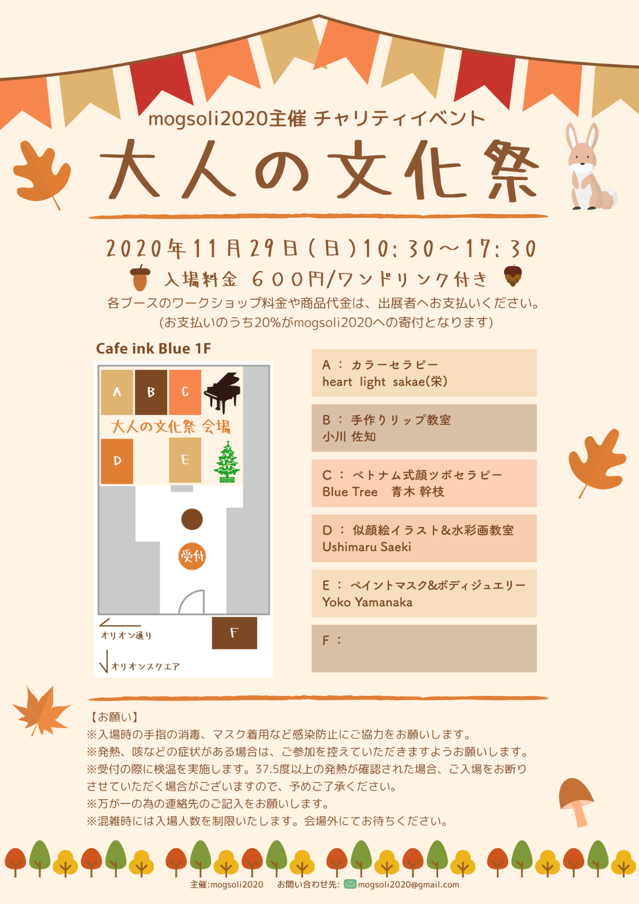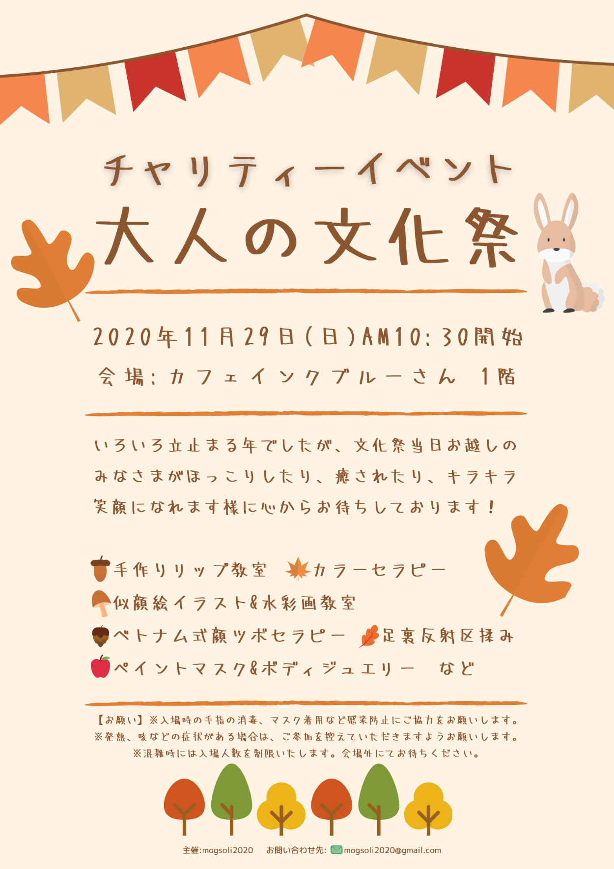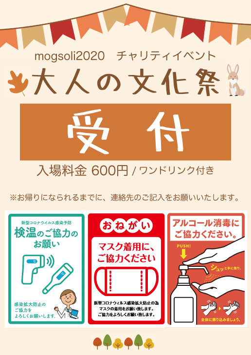 その際に、どんなイベントをやる?という話の中で、私が「今年はフリマや陶器市みたいな即売会イベントがなくなって、出かける楽しみがない。出展の機会も減って、アーティストさんも困ってるだろうね。(学校や地域の運動会や文化祭も中止や縮小開催だし)ワークショップや物販がある大人の文化祭みたいなのやりたいね」と言ったのが盛り上がって、そのまま「大人の文化祭」が採用されました。