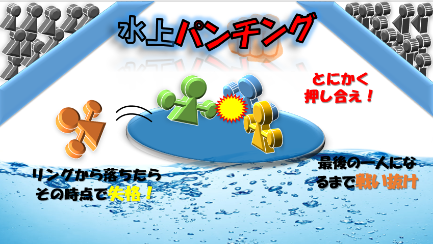 リングの上で最大4人が押し合い最後の一人になるまで戦い抜くゲームとなっております。