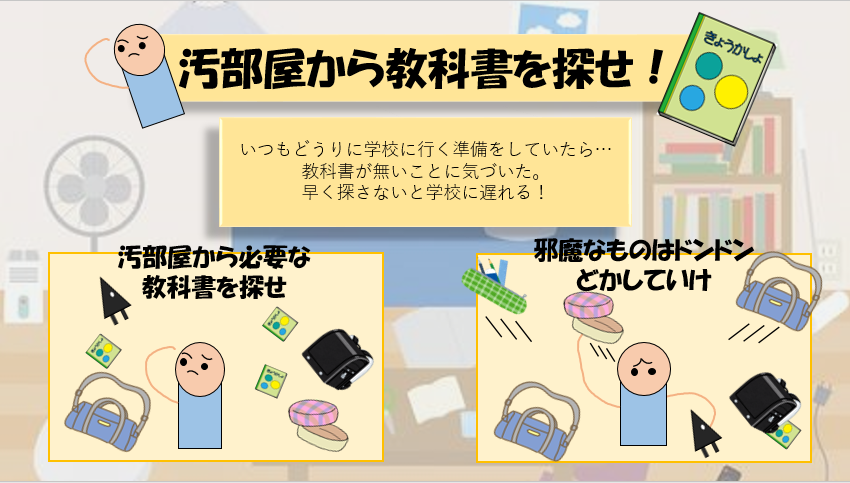 汚部屋から教科書を探して、学校に遅刻しないようにするゲームとなっております。