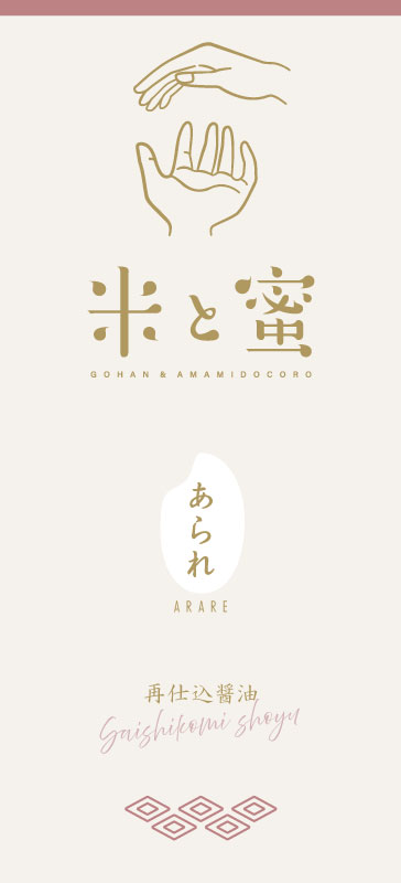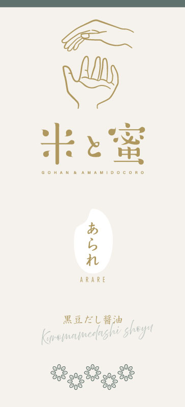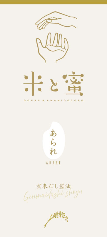 玄米だし醤油… 玄米モチーフは籾の部分を塗と線塗で描くことで動きをつけました。