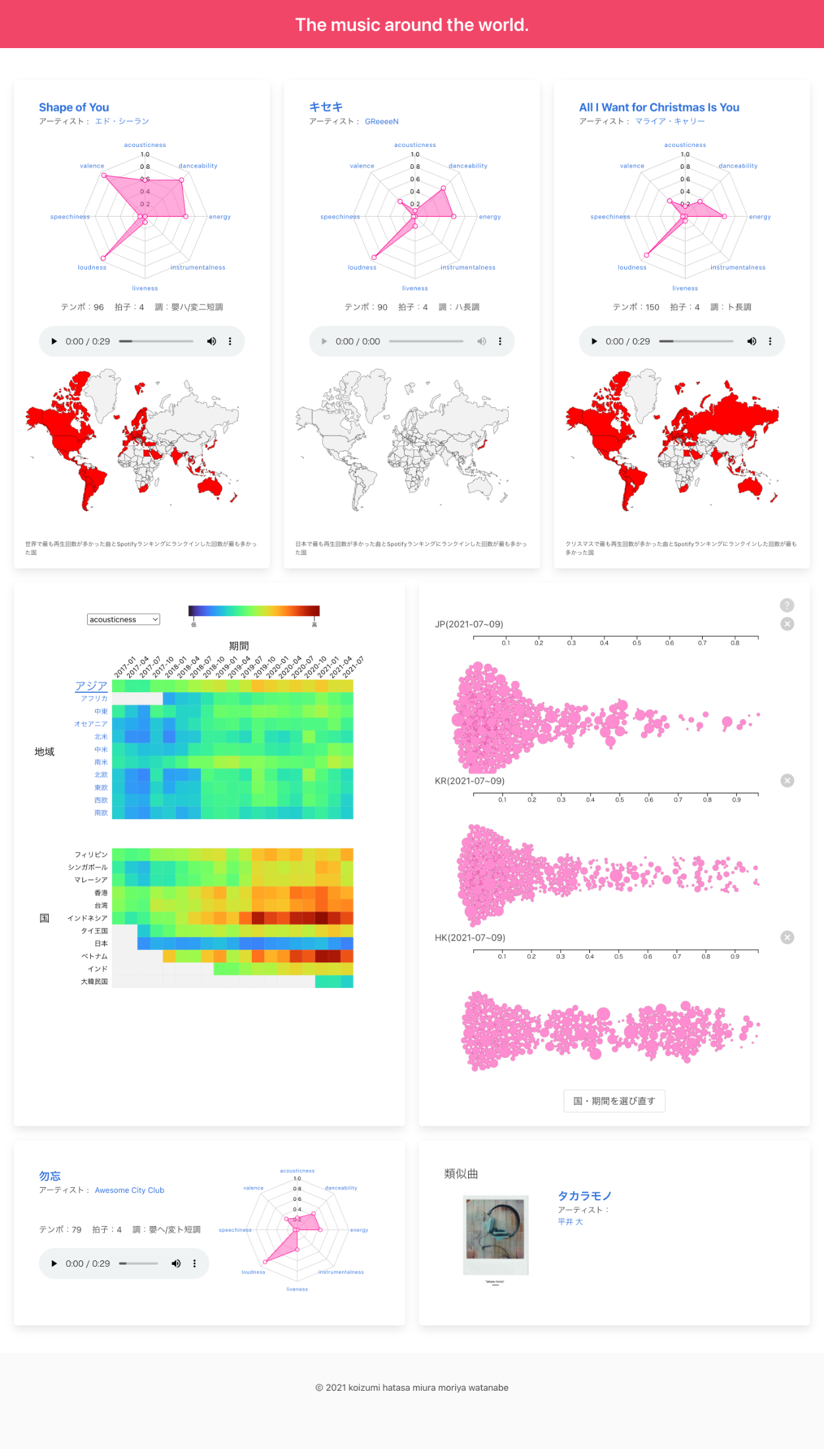 The music around the world. Misato Watanabe 学生 世界各国の音楽流行に関する特徴可視化アプリSpotify ChartとSpotify APIから得られるデータを用いて地域、国、期間ごとの音楽の特徴を可視化したものです。※一部分の制作に参加 WEBSITE