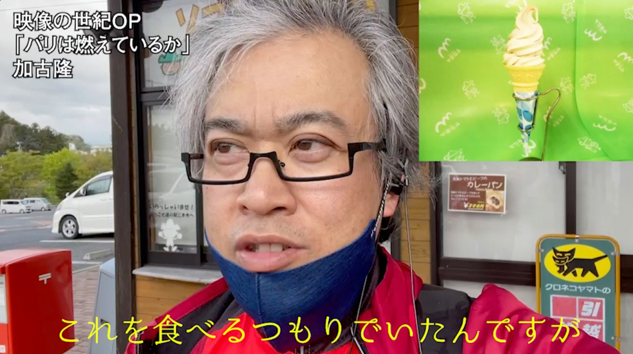 自転車で走る画だけでは面白くないので、途中何箇所か自転車から降りて旅ドキュメンタリーらしくハプニング的な映像も撮りました。これは三本木町の道の駅の名物ひまわりソフトクリームを食べられなかったというハプニング的映像です。