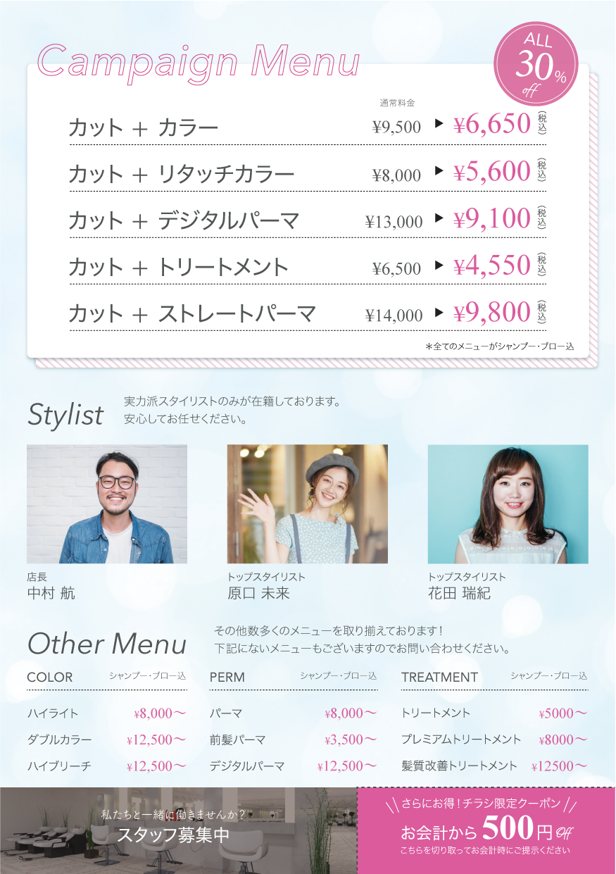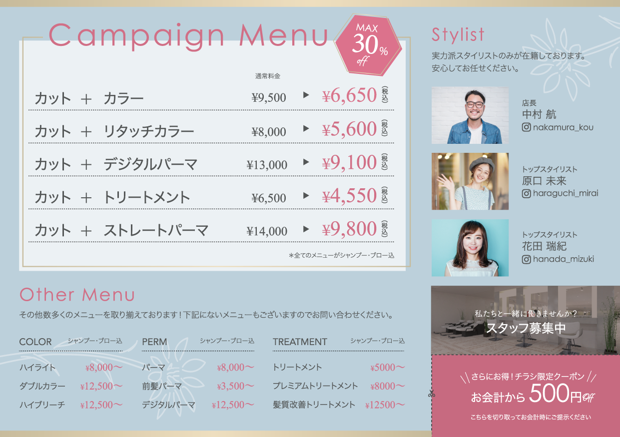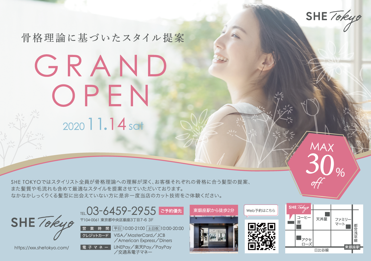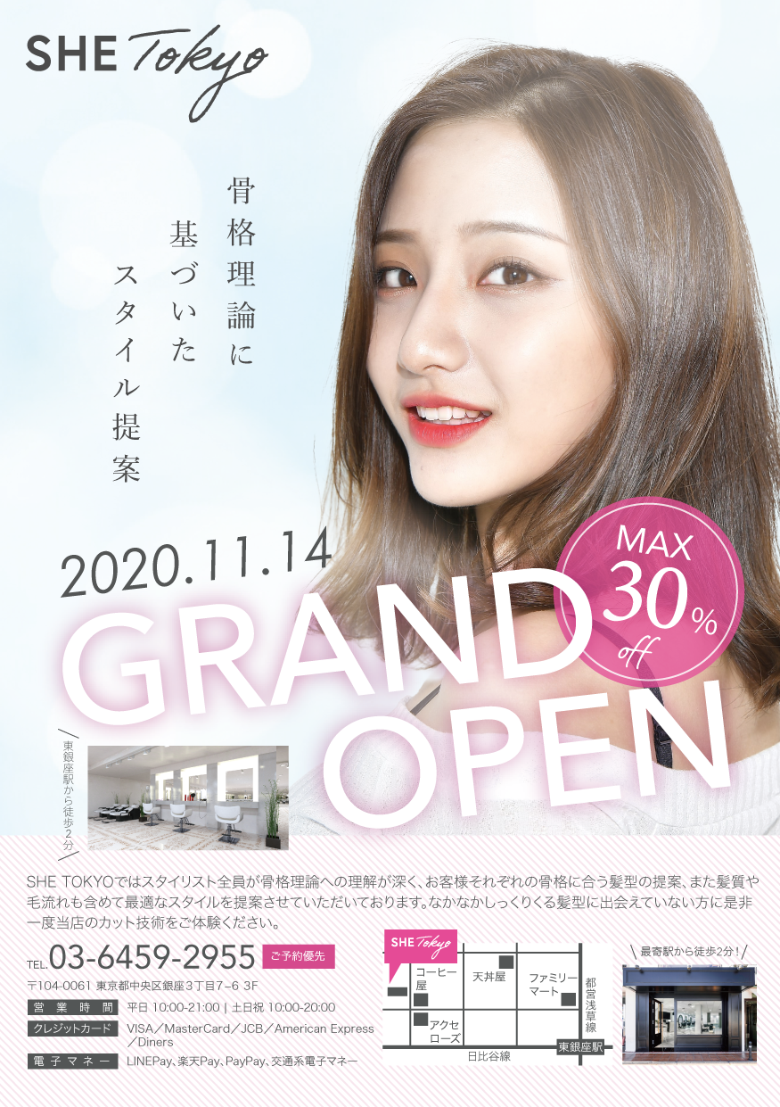 SHElikes マルチクリエイターコースの課題で架空の美容院のGRAND OPENのフライヤーを作成しました。【制作期間:1週間】【使用ツール:Illustrator】