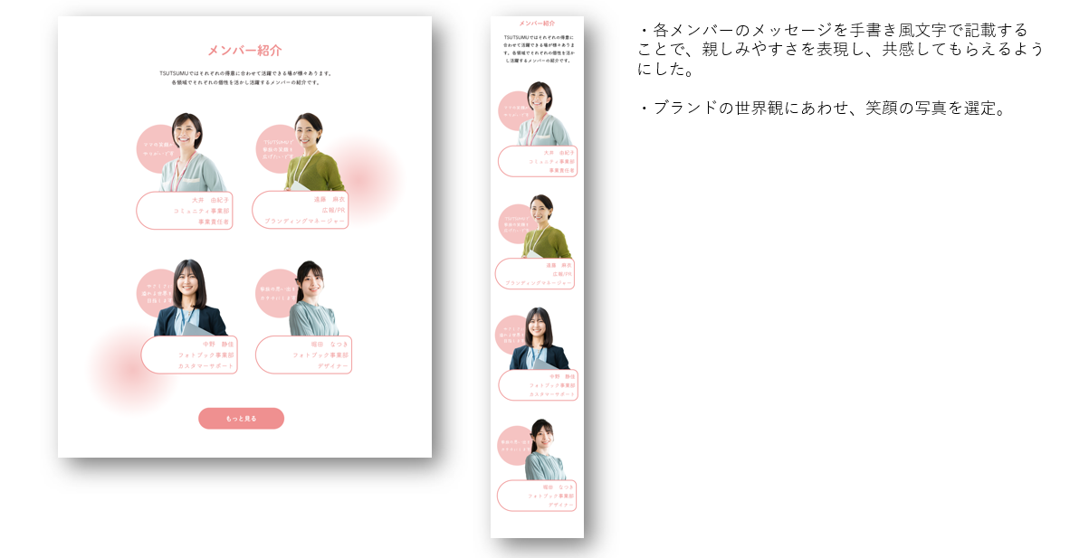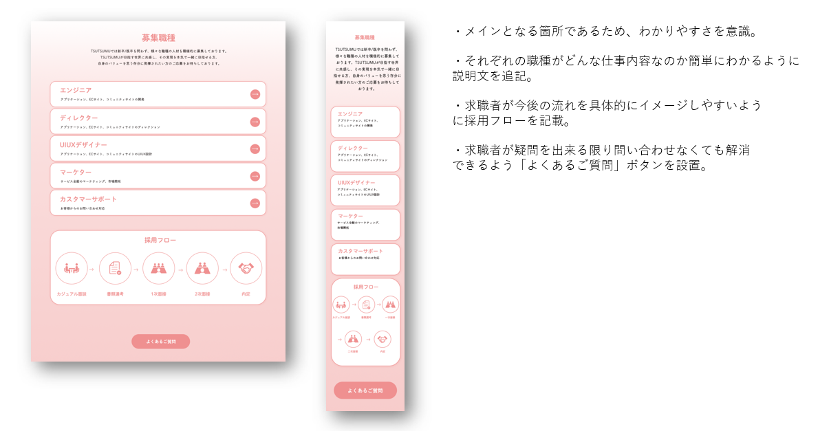 実際にコーディングをすることで、デザインの時点で、ある程度コーディングを意識しながら作成することの重要性を実感しました。また、採用サイトとして必要な要素やデザインの方向性が、同じ企業でもコーポレートサイトとは異なることを学びました。
