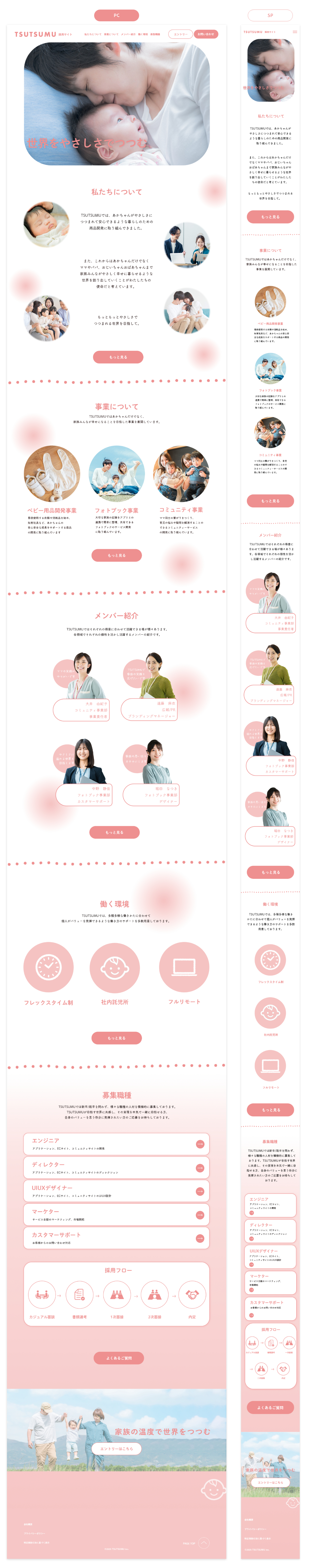 ・必要セクション情報(キービジュアル、私たちについて、働く環境、事業について、募集職種、メンバー紹介、エントリー、フッター)