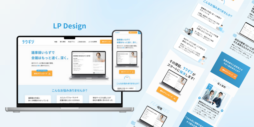 SHElikesの課題でAI議事録作成ツールのLPデザインを制作。 架空のクライアントからの依頼内容を想定しデザインカンプを制作しました。