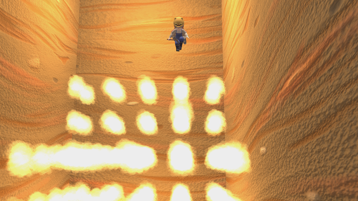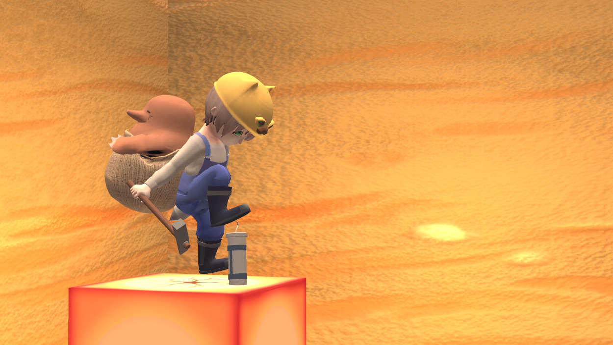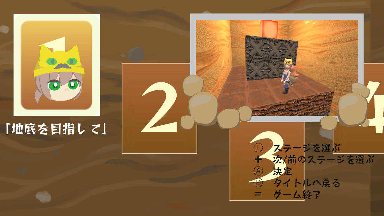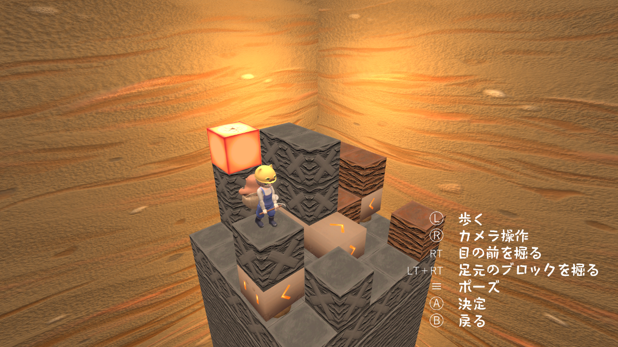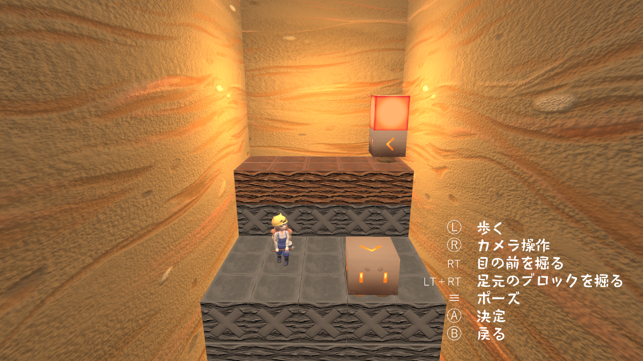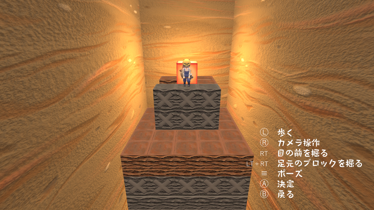 ステージに配置されている土のブロックを壊して進みオレンジのブロック(核ブロック)を目指します。土ブロックは一個分上に乗ることができます。