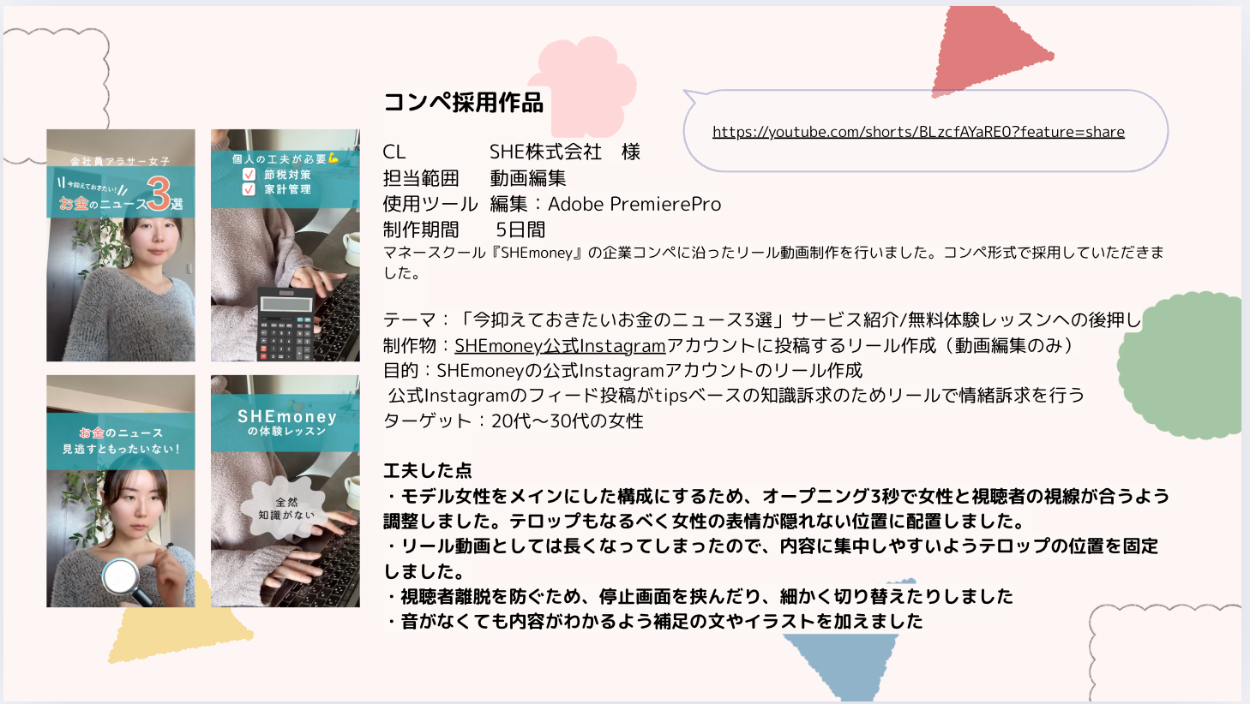 SHE株式会社様の運営するマネースクール『SHEmoney』の企業コンペに沿ったリール動画制作を行いました。コンペ形式で採用していただきました。動画再生数3000回超え[ 編集:Adobe PremierePro ]