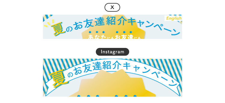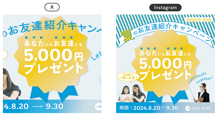 「X版」「Instagram版」ともに、インパクトの強い色鮮やかで大きな黄色のメダリオンを上下の枠から飛び出すように大きく配置しました。キャッチコピーの「5,000円プレゼント」は、ボリューム感のあるフォントを使用し、ターゲットの目を惹きつけるよう設計しました。