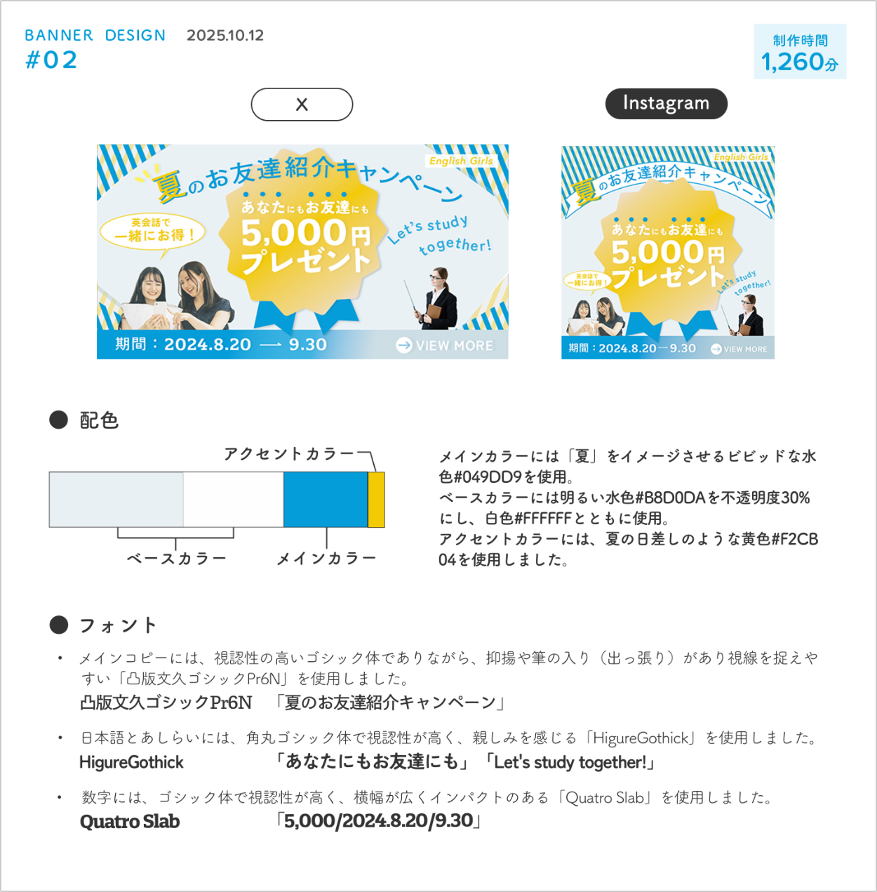 トンマナを決定する際に、カラーの本や他のバナー作品を自分で確認するだけでなく、市場調査をすることの重要さを学びました。今回は「夏らしいバナー」という要件のため、「夏らしさ」を表現するトンマナとは何かを、市場でリサーチし、「ビビッドな水色や青色と、黄色の組み合わせ」を使用しました。